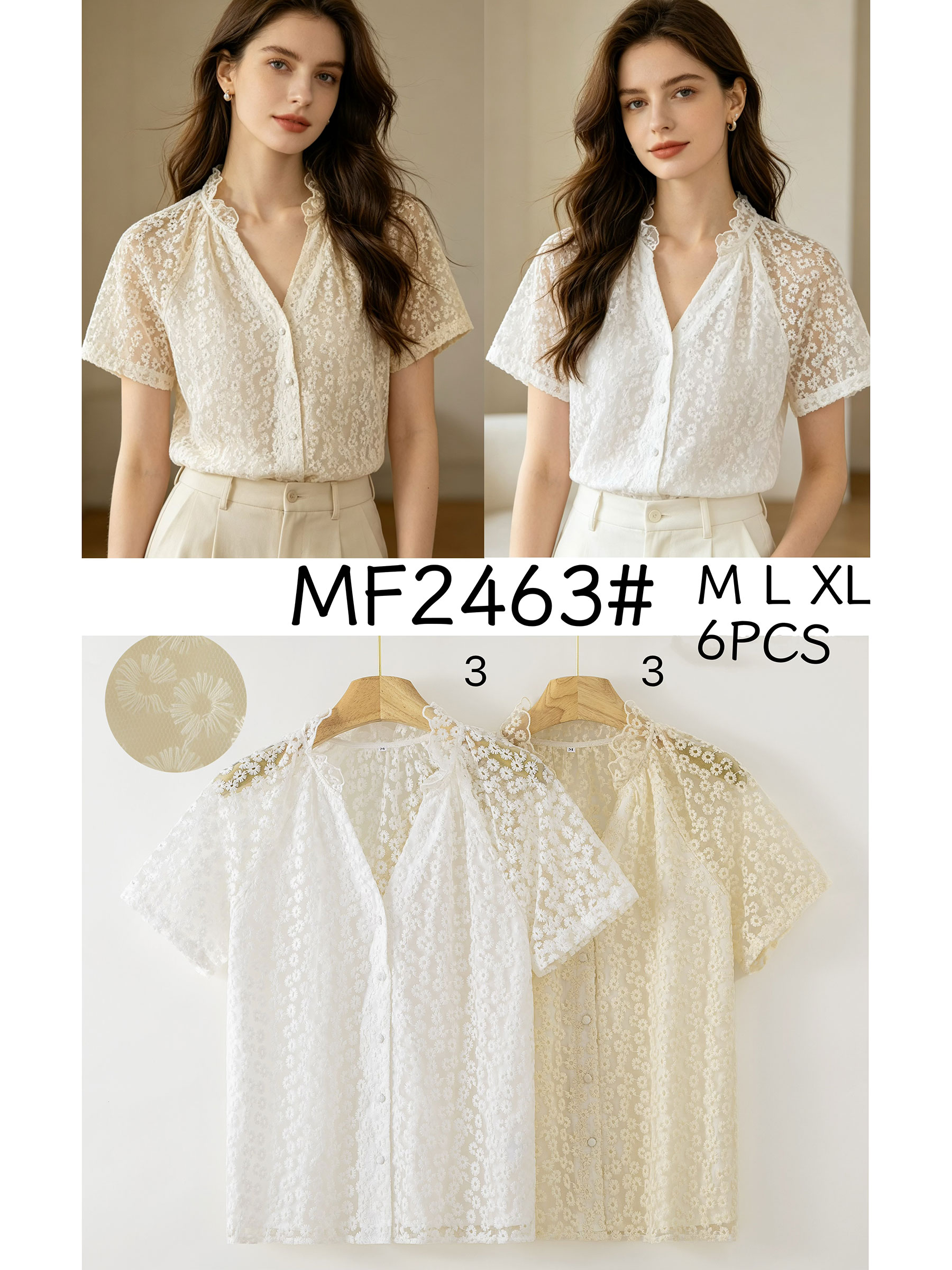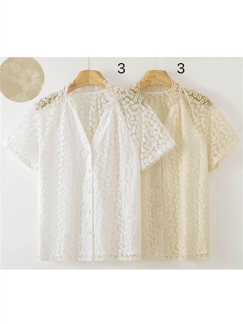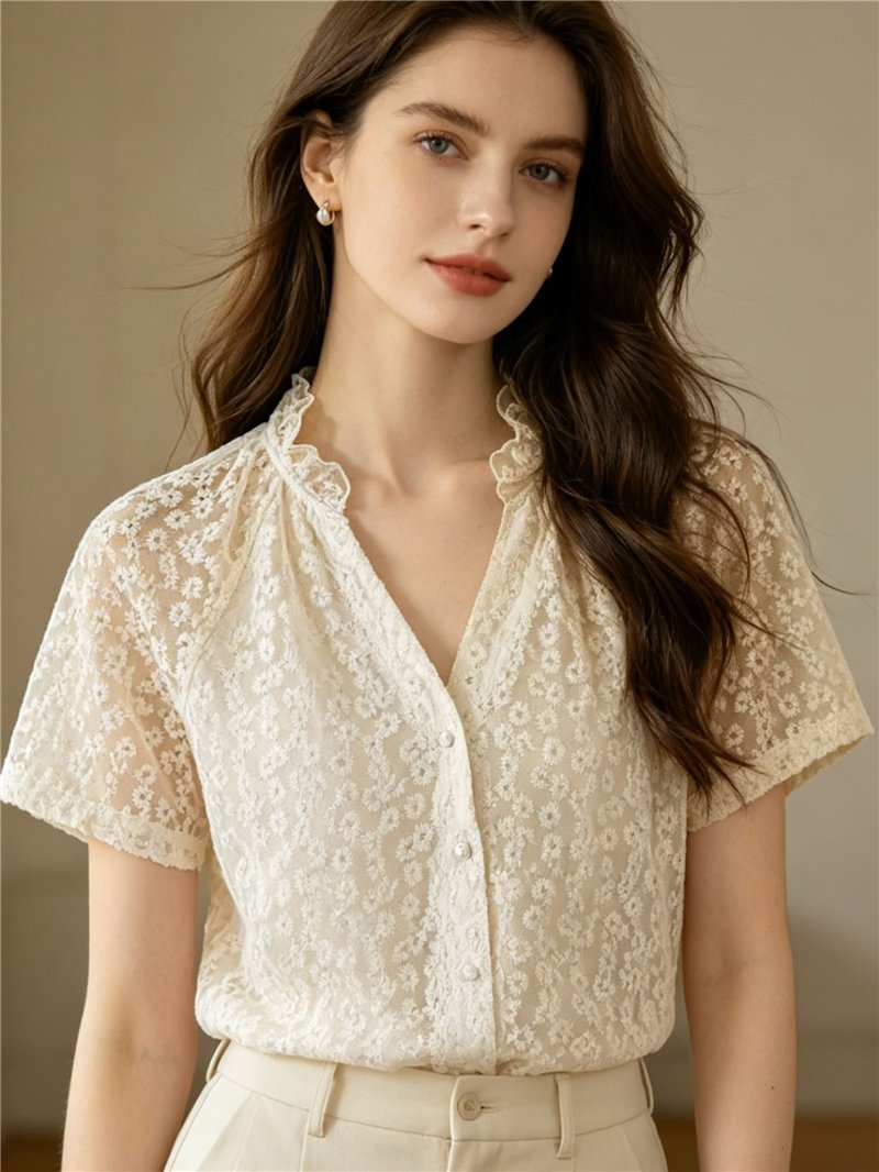 Camicetta semitrasparente in pizzo floreale con maniche corte e colletto a balze.
