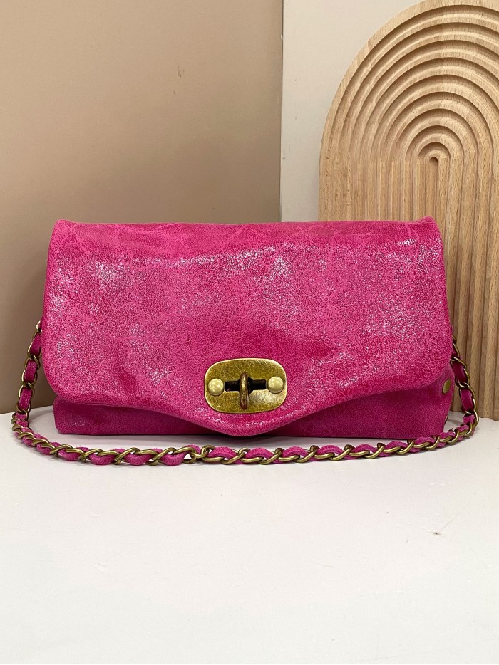 Mini borsa a mano in pelle. Manico a catena. Tracolla regolabile e rimovibile. Chiusura metallica sulla patta. Prodotto in Italia.