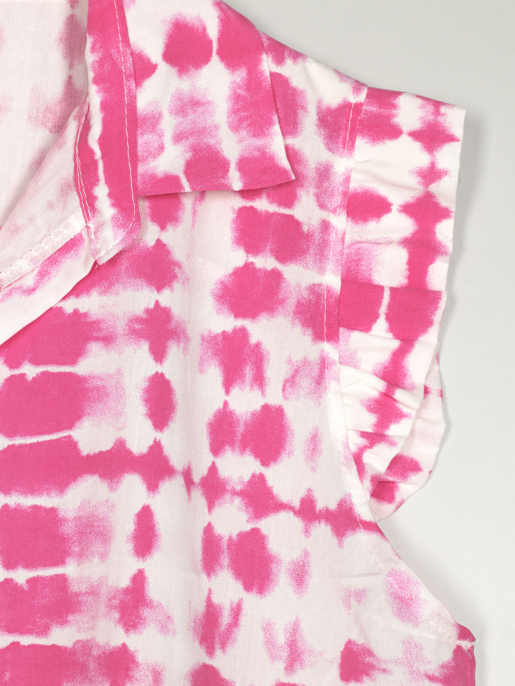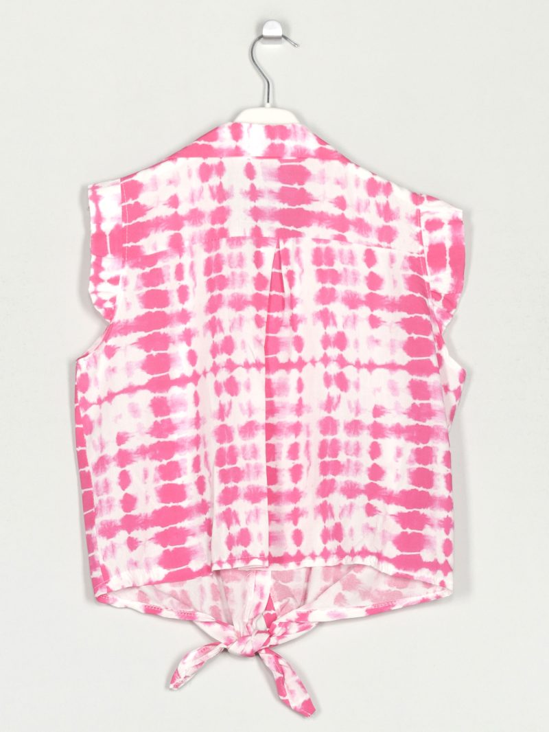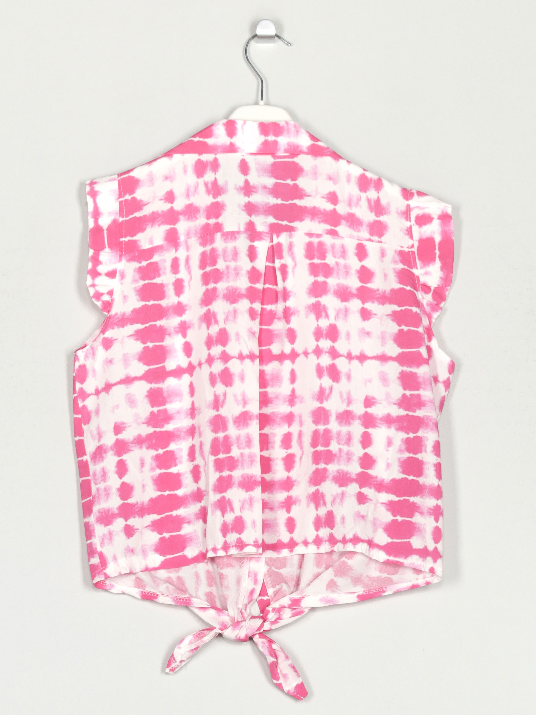 Camicia corta tie-dye. Dettaglio nodo. Collo a revers. Chiusura con bottoni. Senza maniche con volant.