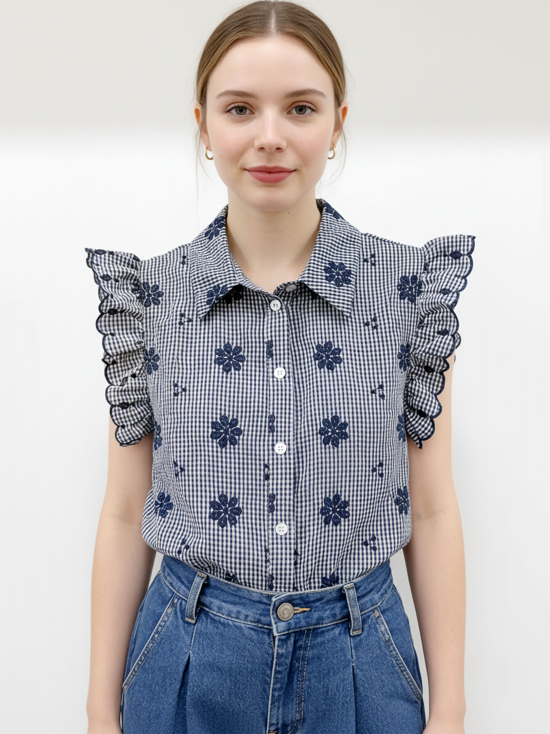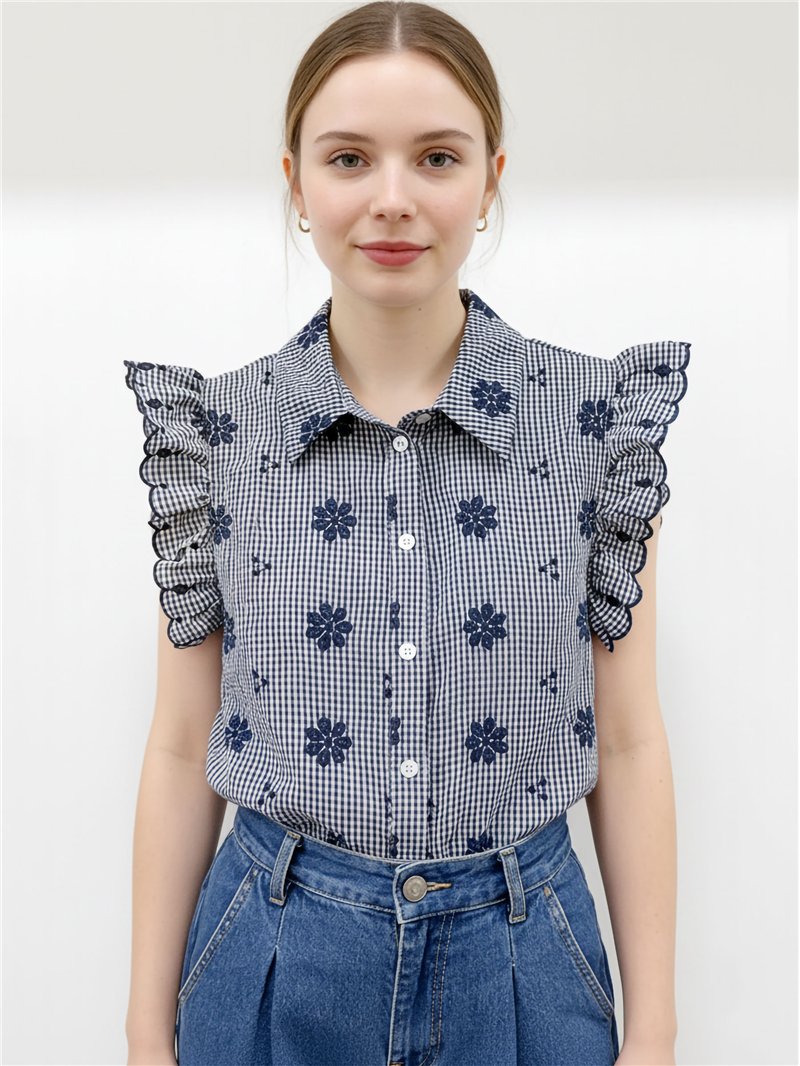 Camicia a quadretti. Dettagli floreali ricamati. Collo a revers. Giromanica a volant. Chiusura con bottoni.