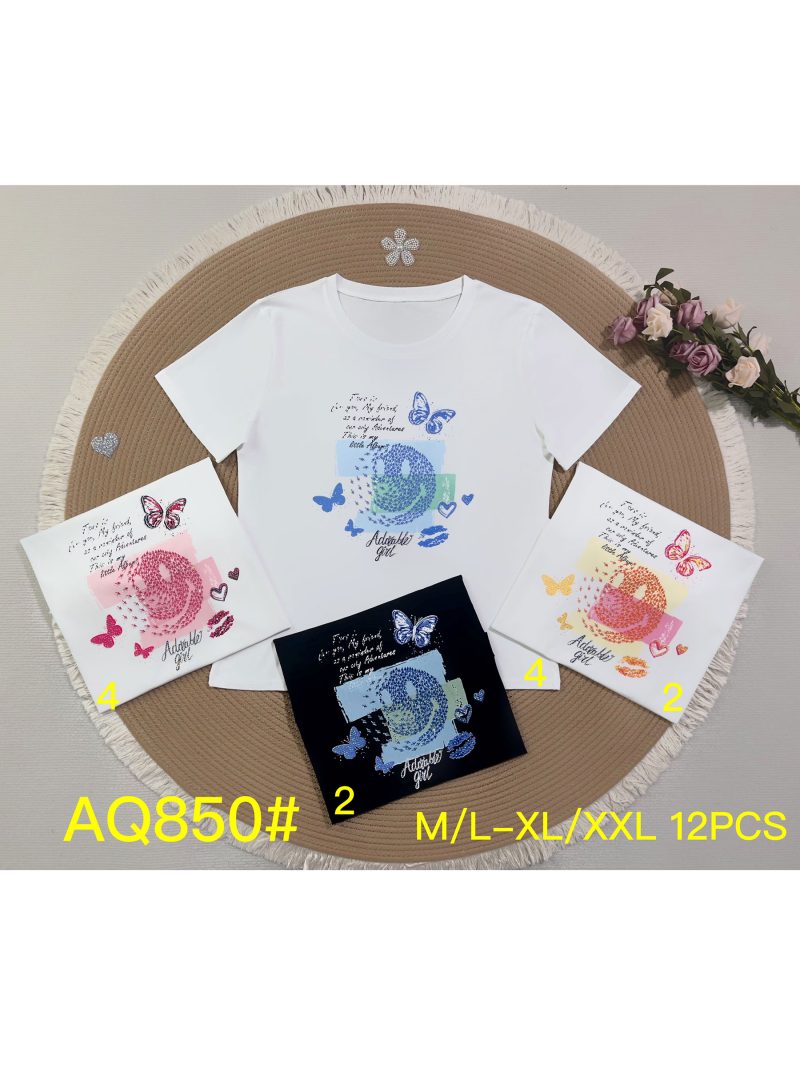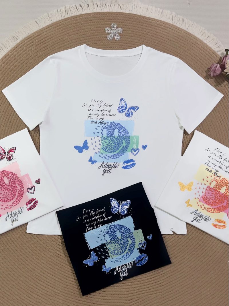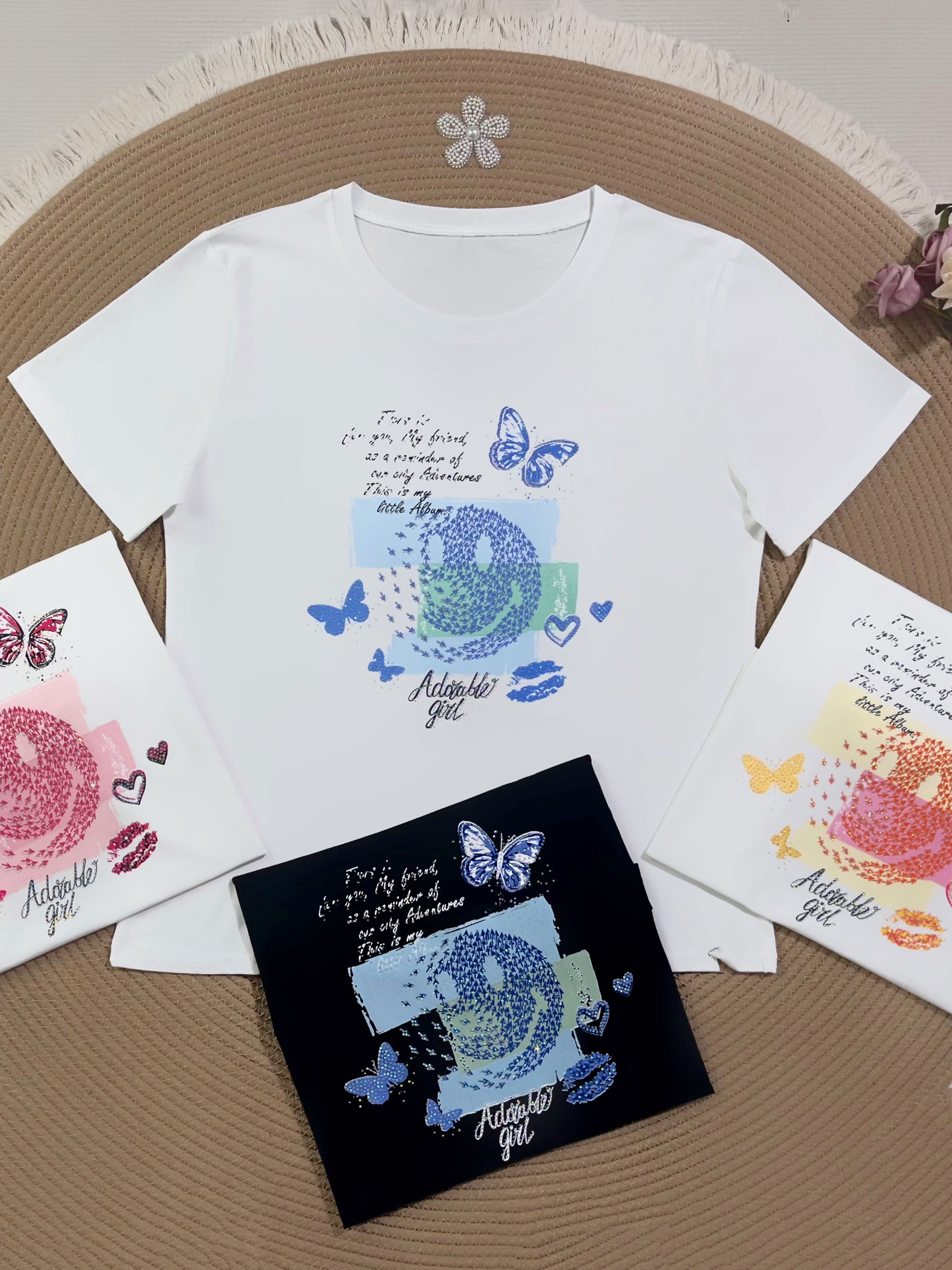 T-shirt stampata. Dettaglio di strass. Scollo rotondo. Maniche corte. Tessuto elasticizzato.