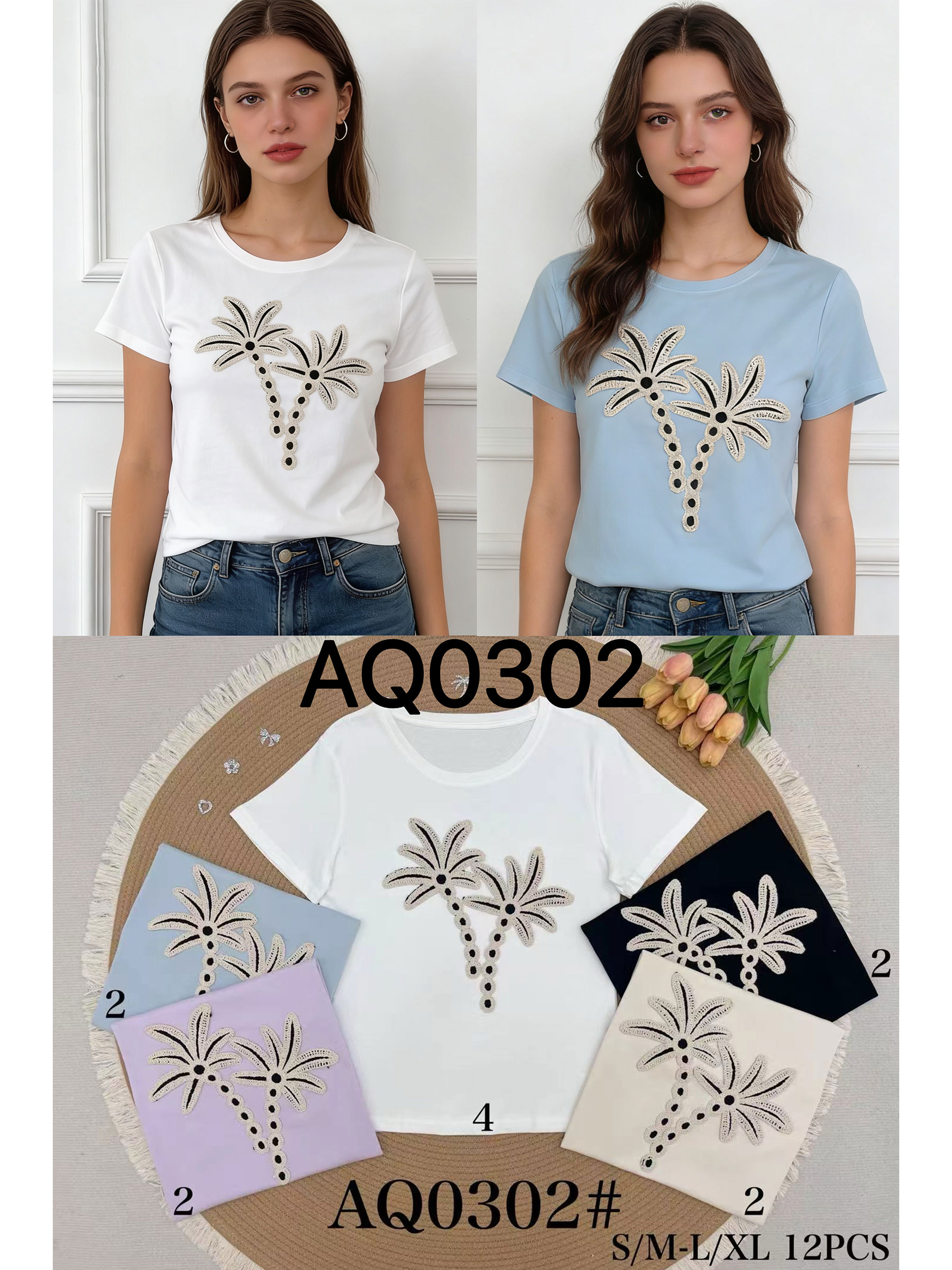 T-shirt con applicazione di palma all'uncinetto a contrasto. Scollo rotondo. Maniche corte. Tessuto elasticizzato.