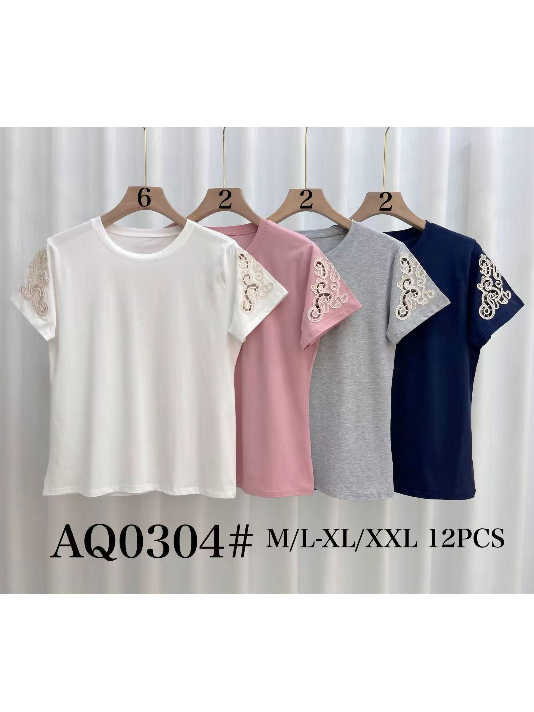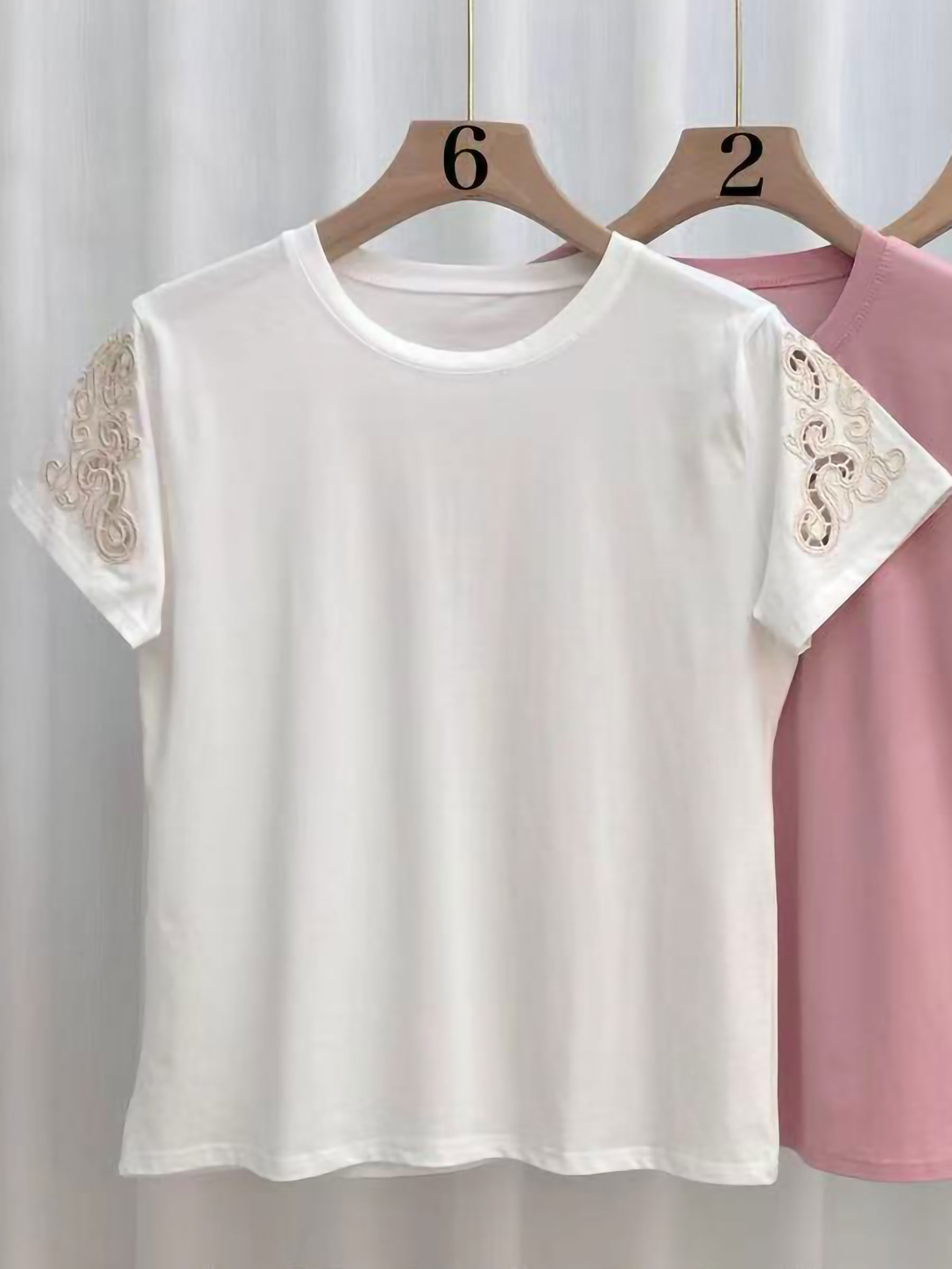 T-shirt semplice. Maniche corte con pizzo ricamato. Scollo rotondo. Tessuto elasticizzato.