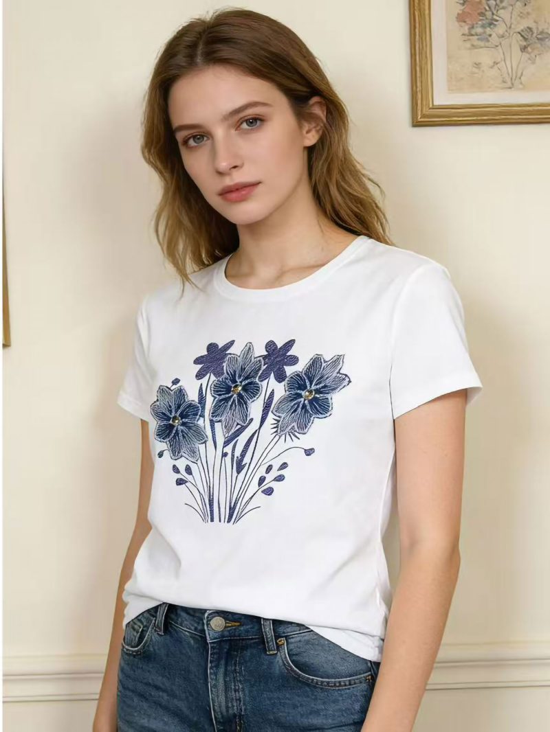 T-shirt basic. Stampa floreale blu. Scollo rotondo. Maniche corte. Tessuto elasticizzato.