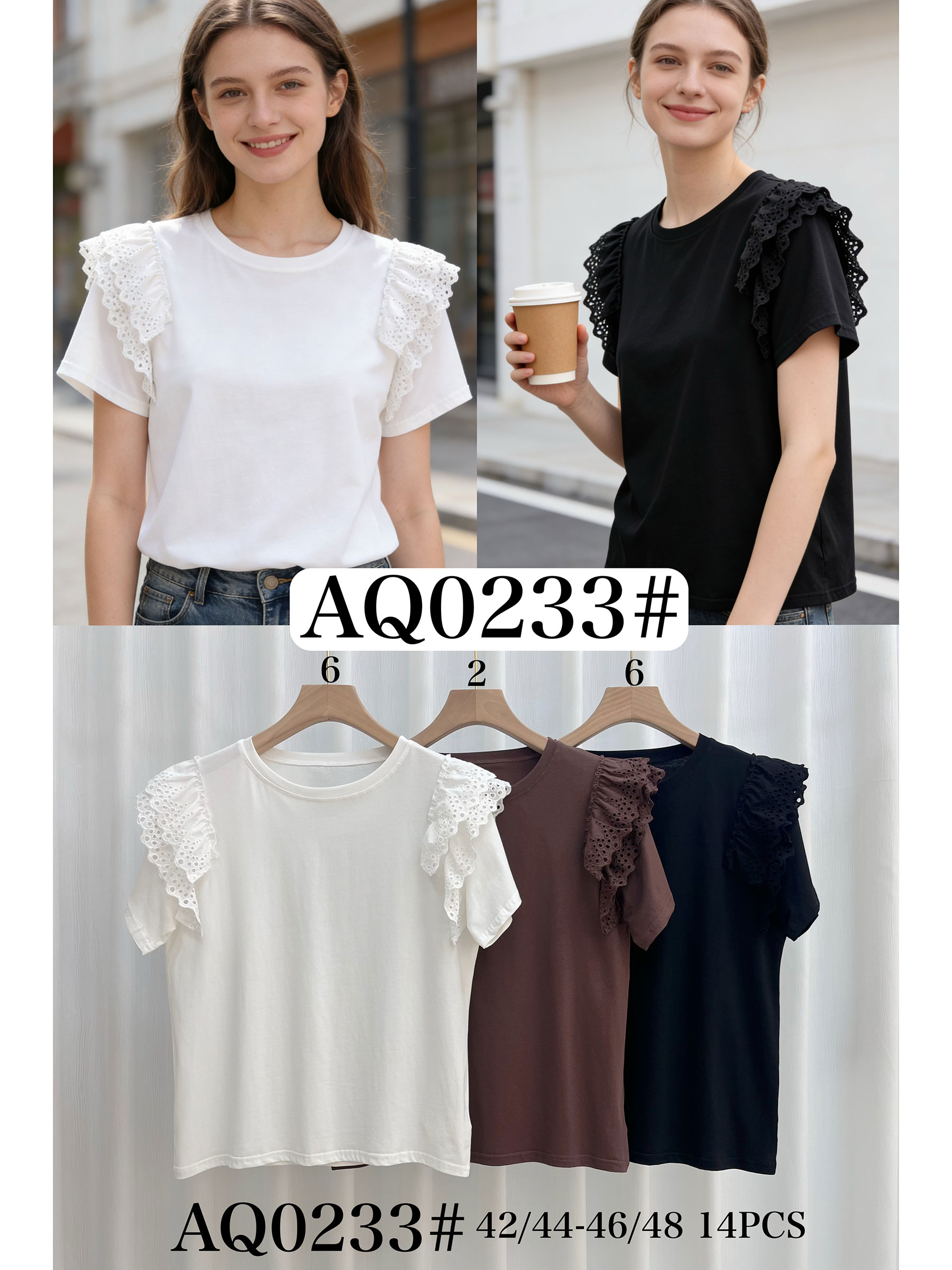 T-shirt a maniche corte. Volant in pizzo sulle spalle. Scollo rotondo. Tessuto elasticizzato.