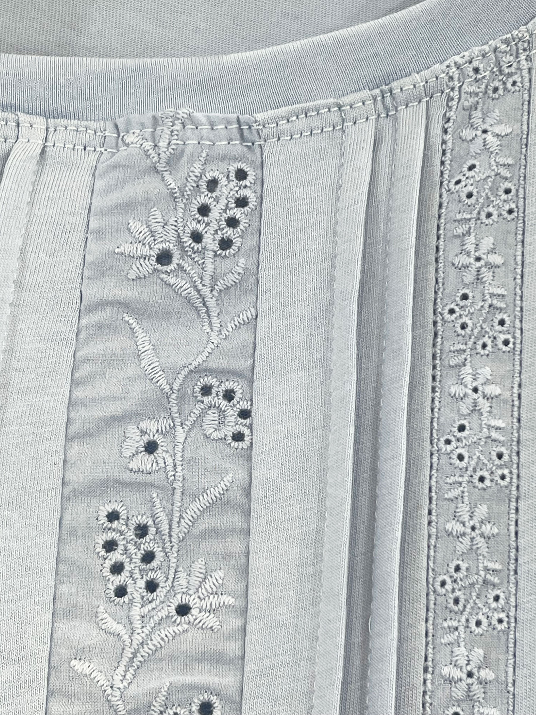 T-shirt a maniche corte. Pannello frontale ricamato. Bordi in pizzo verticale. Scollo rotondo. Tessuto elasticizzato.
