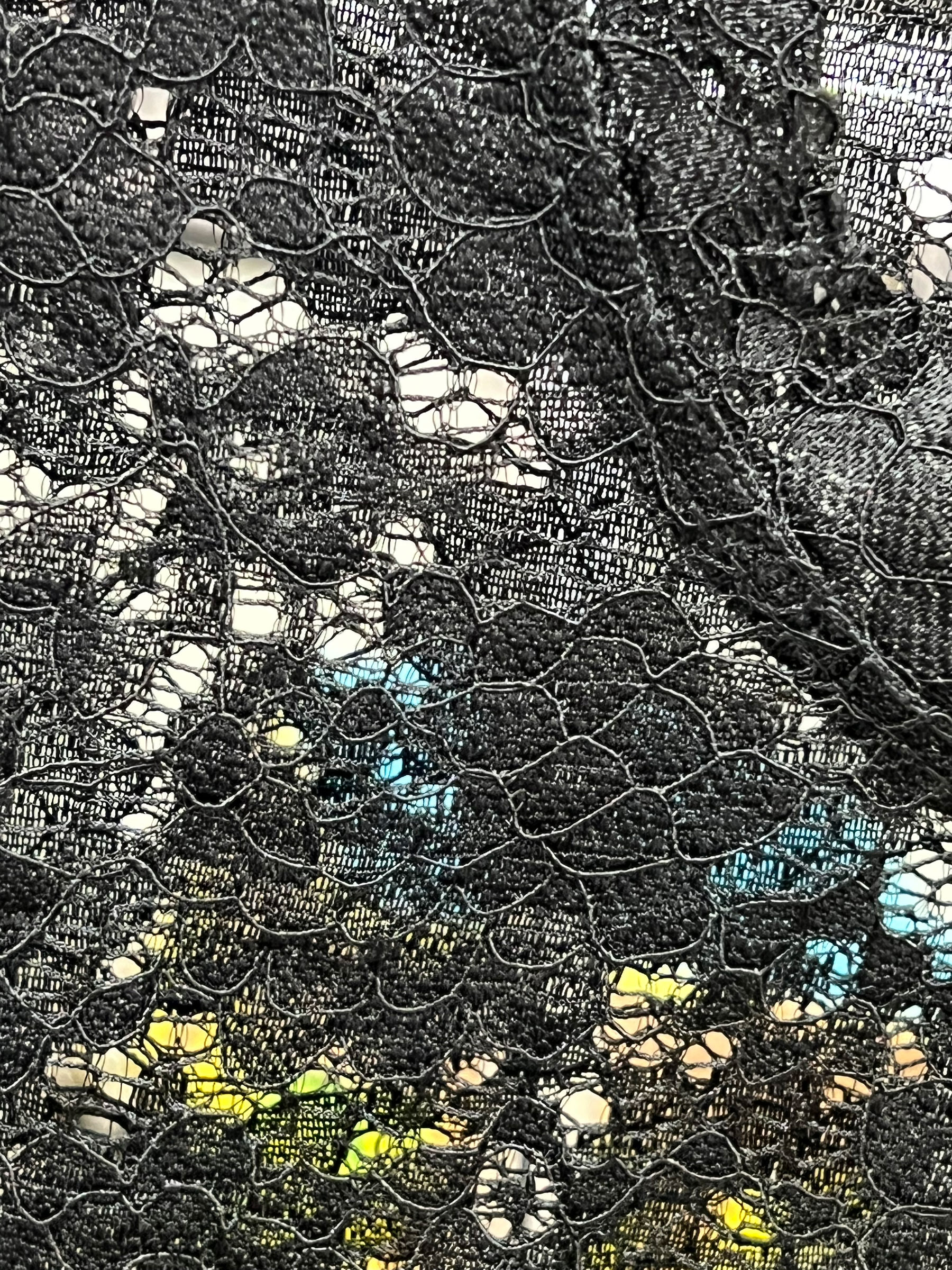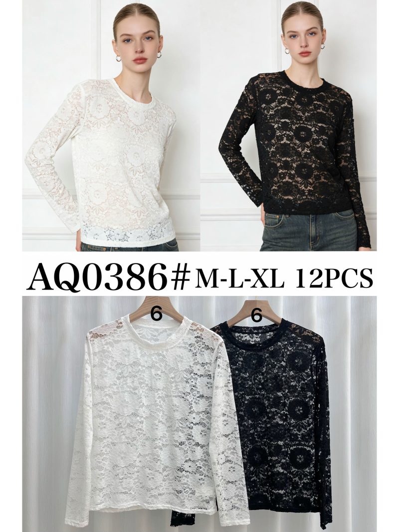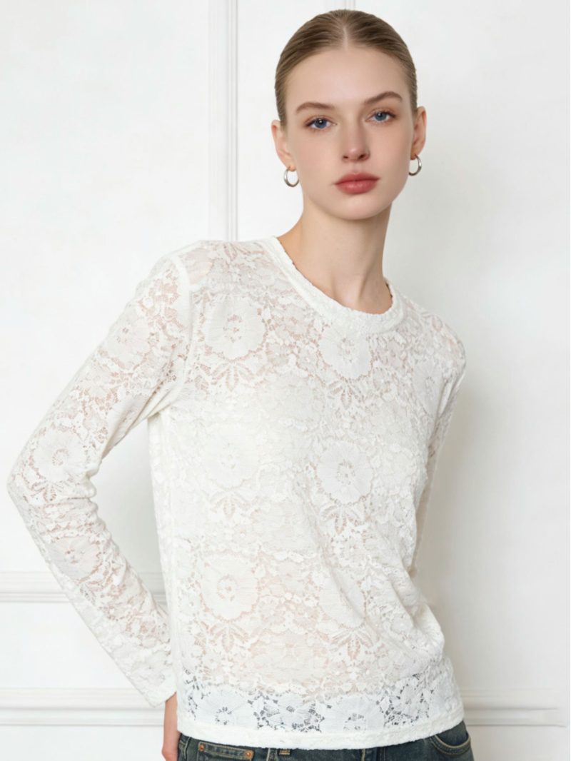 T-shirt in pizzo semitrasparente. Maniche lunghe. Scollo rotondo. Fantasia floreale.