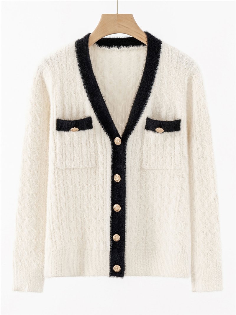 Giacca in maglia morbida con pelliccia contrastante e bottoni dorati.
