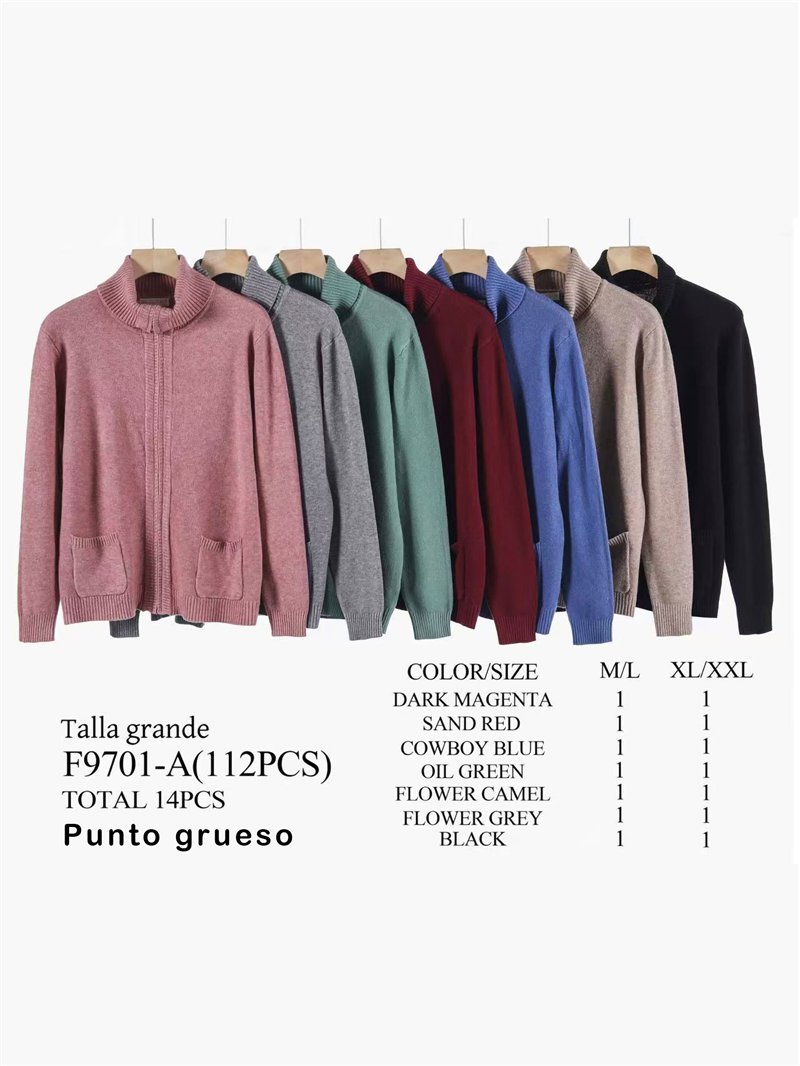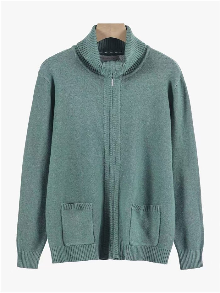 Giacca in maglia spessa. Tocco morbido. Collo alto. Finiture a costine. Tasche anteriori a toppa. Manica lunga. Chiusura anteriore con zip.