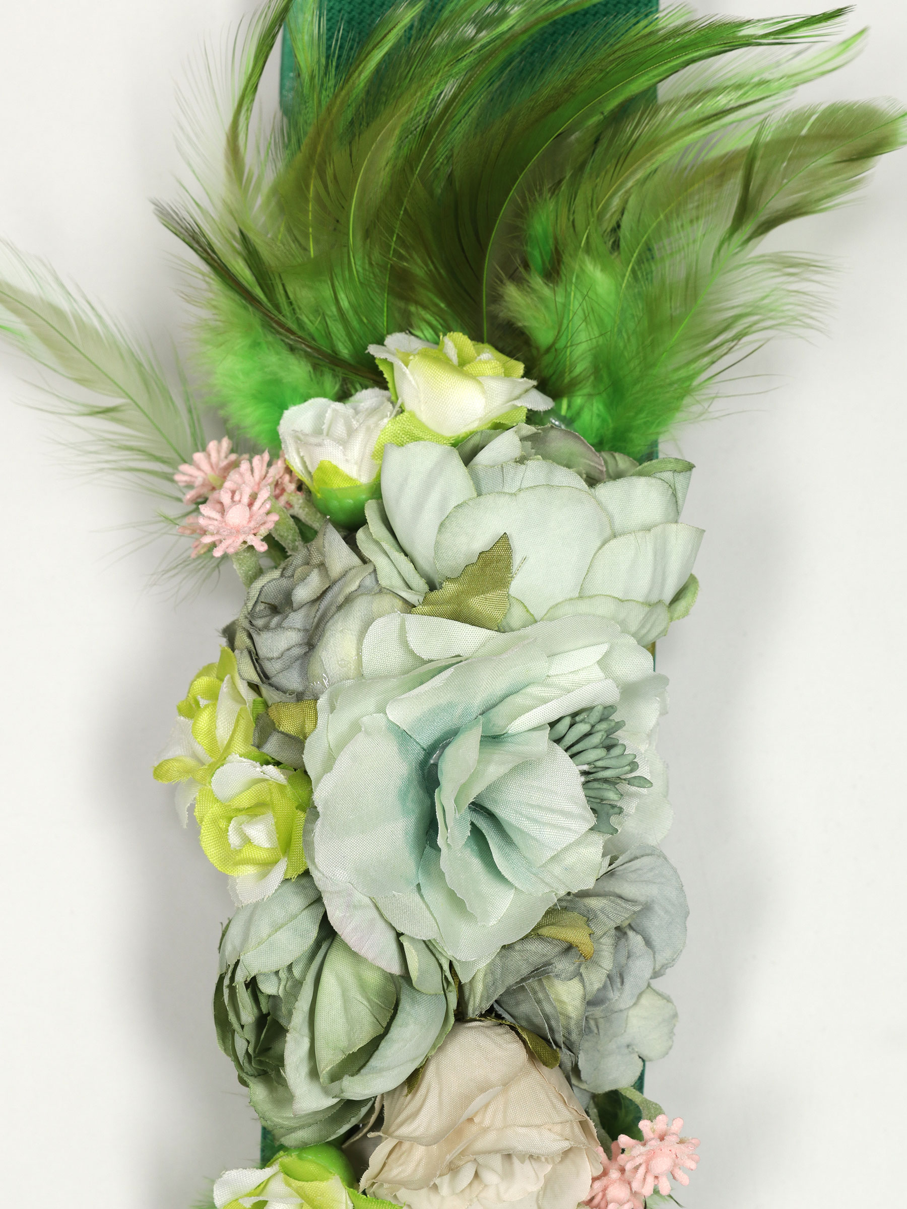 Cintura elastica con applicazione di fiori e piume. Chiusura con bottoni a pressione.