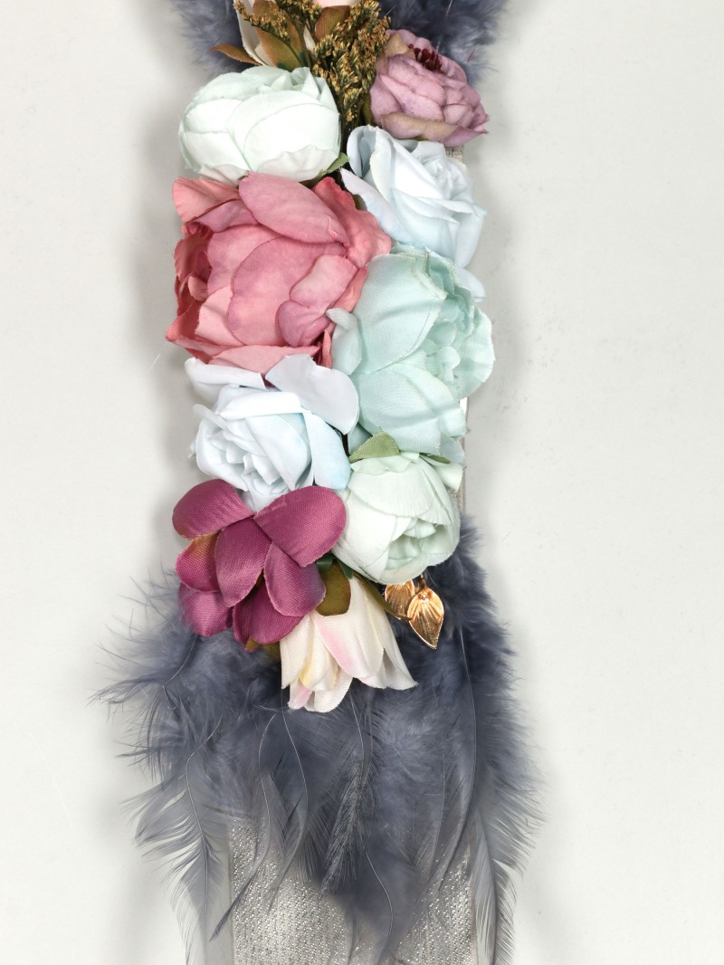 Cintura elastica con applicazione di fiori e piume.