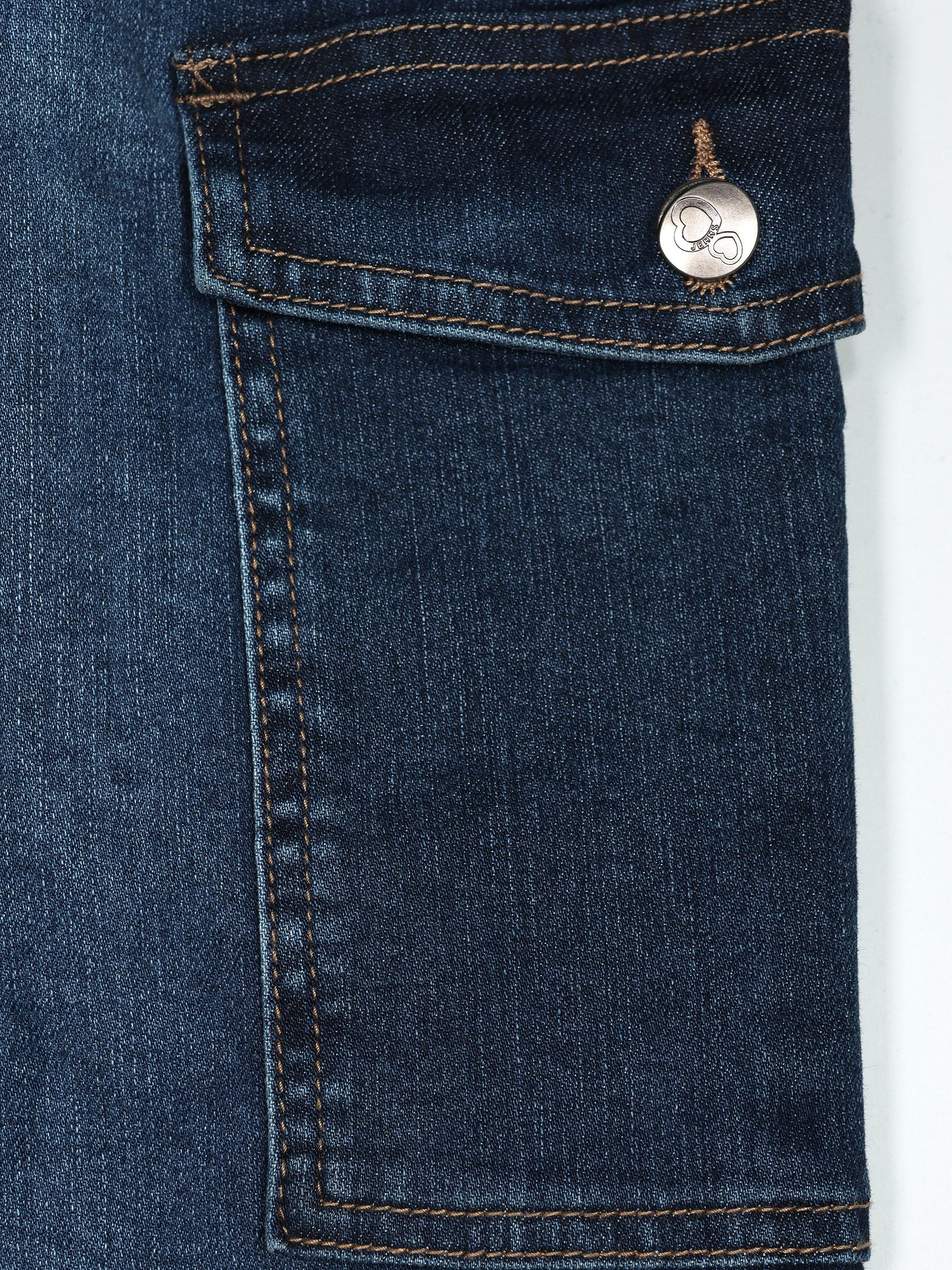 Gonna midi in denim. Tasche a toppa con patta. Chiusura frontale con zip e bottone metallico.