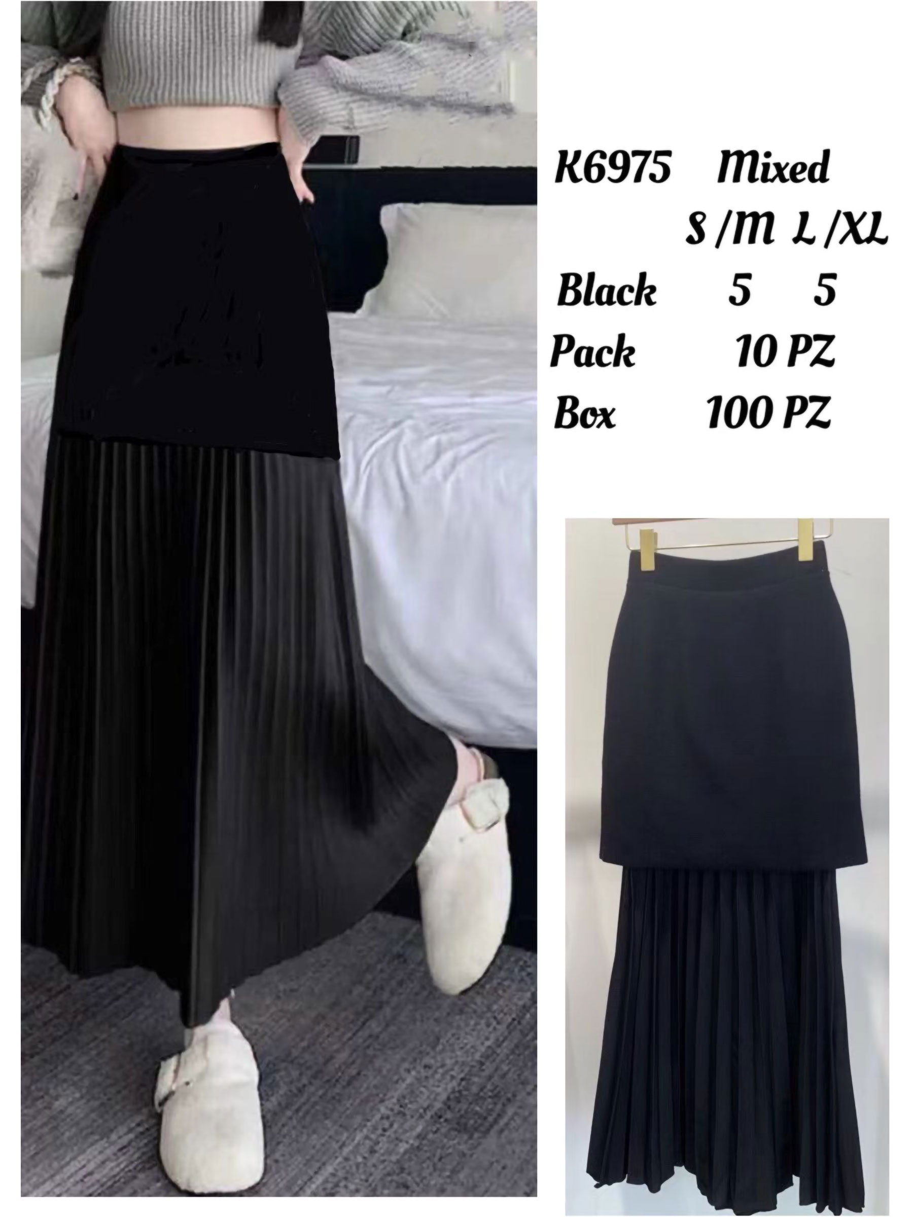 Gonna lunga abbinata con top liscio e parte inferiore plissettata. Vita elastica e senza chiusura.