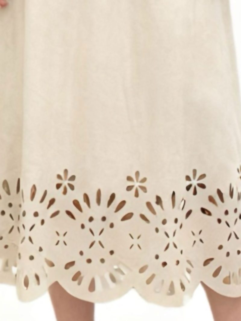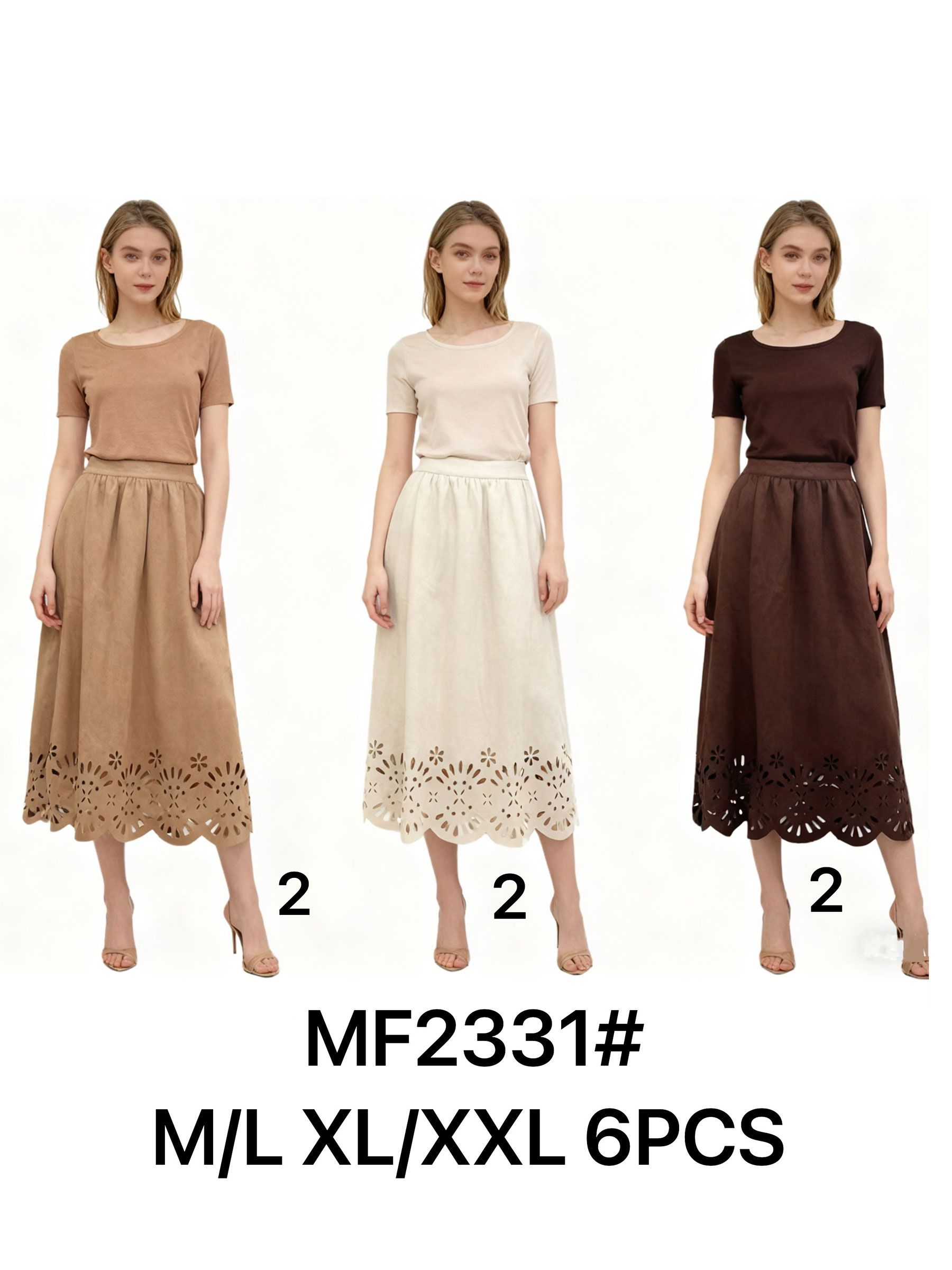 Gonna midi in camoscio sintetico con fodera. Vita elastica. Orlo con taglio laser. Taglio a ruota.