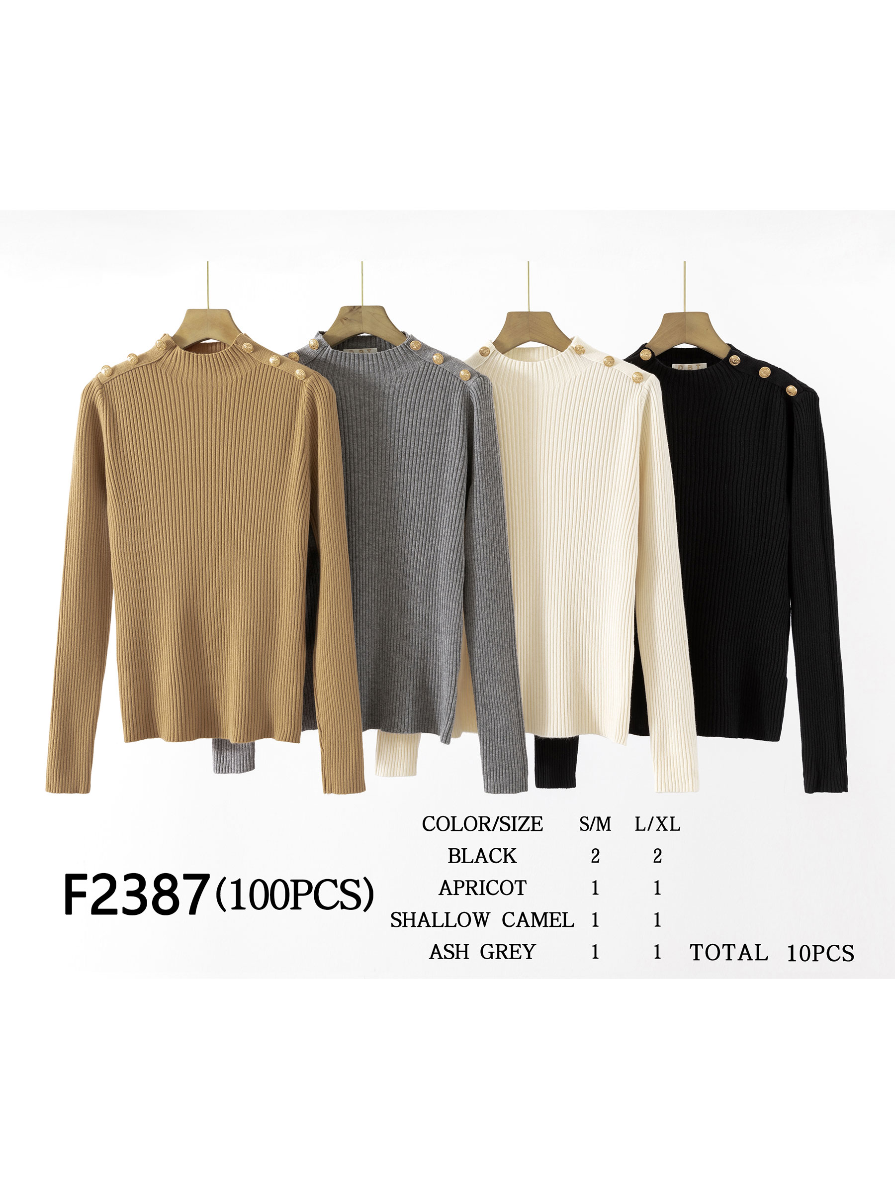 Maglione a coste. Maglia sottile. Colletto alla coreana. Dettaglio bottoni sulle spalle. Manica lunga.