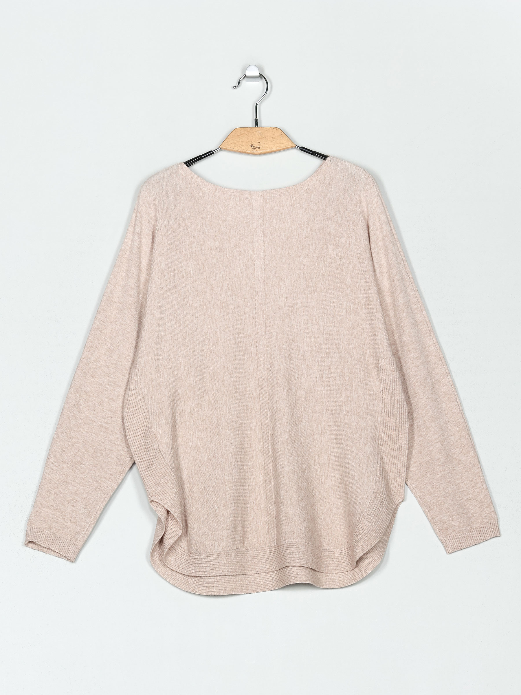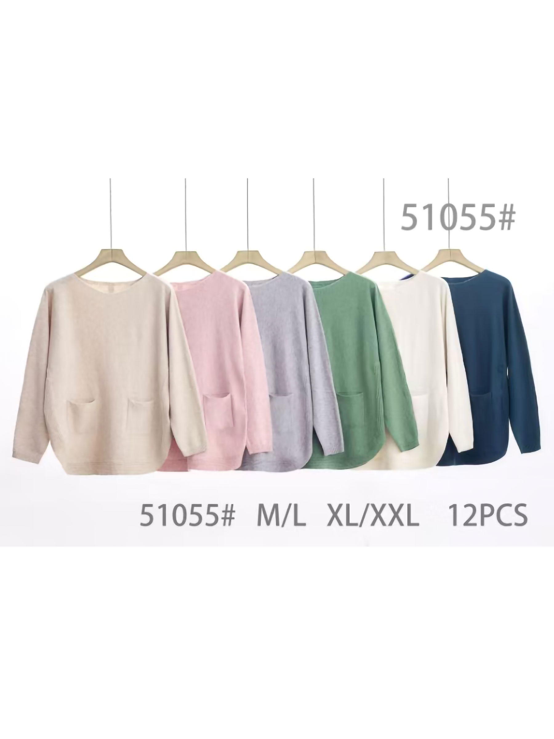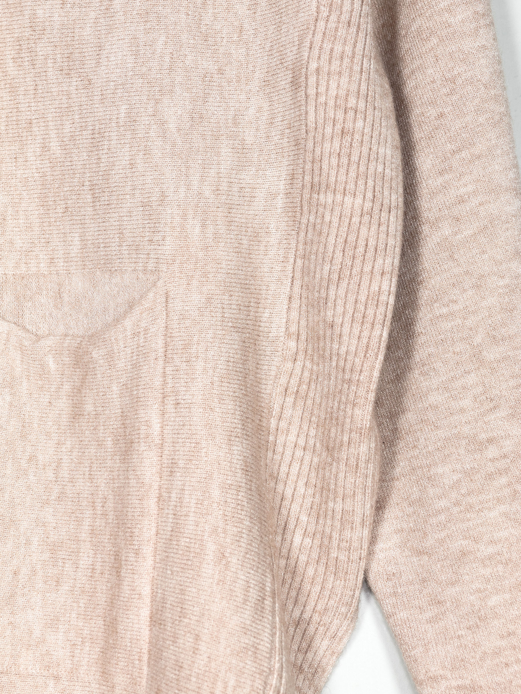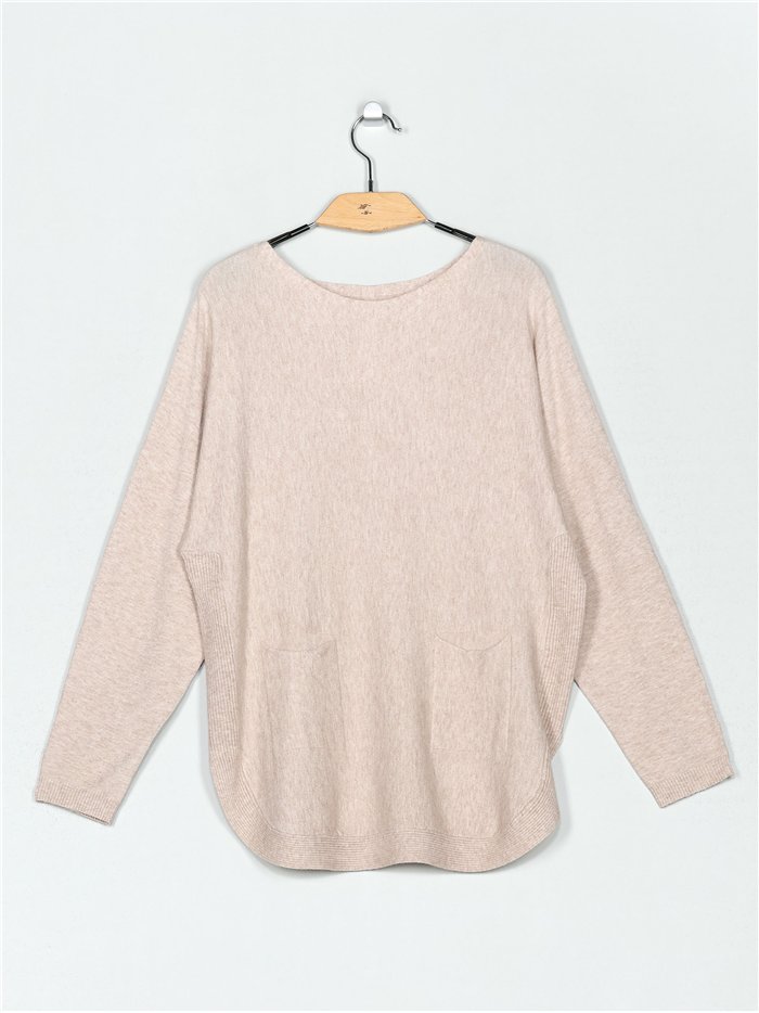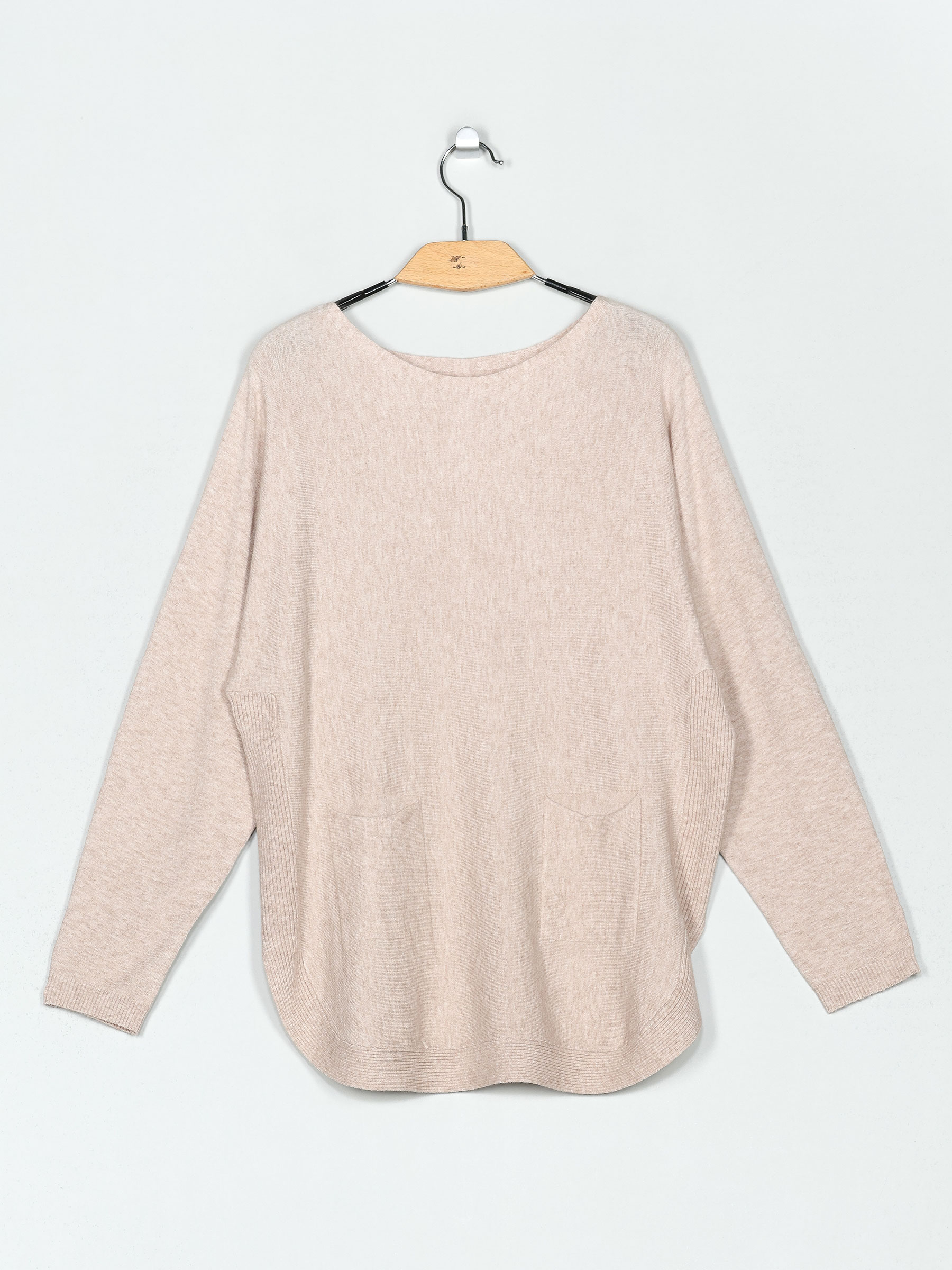 Maglione a maglia fine. Finiture a costine. Dettaglio tasche. Collo rotondo. Manica lunga.