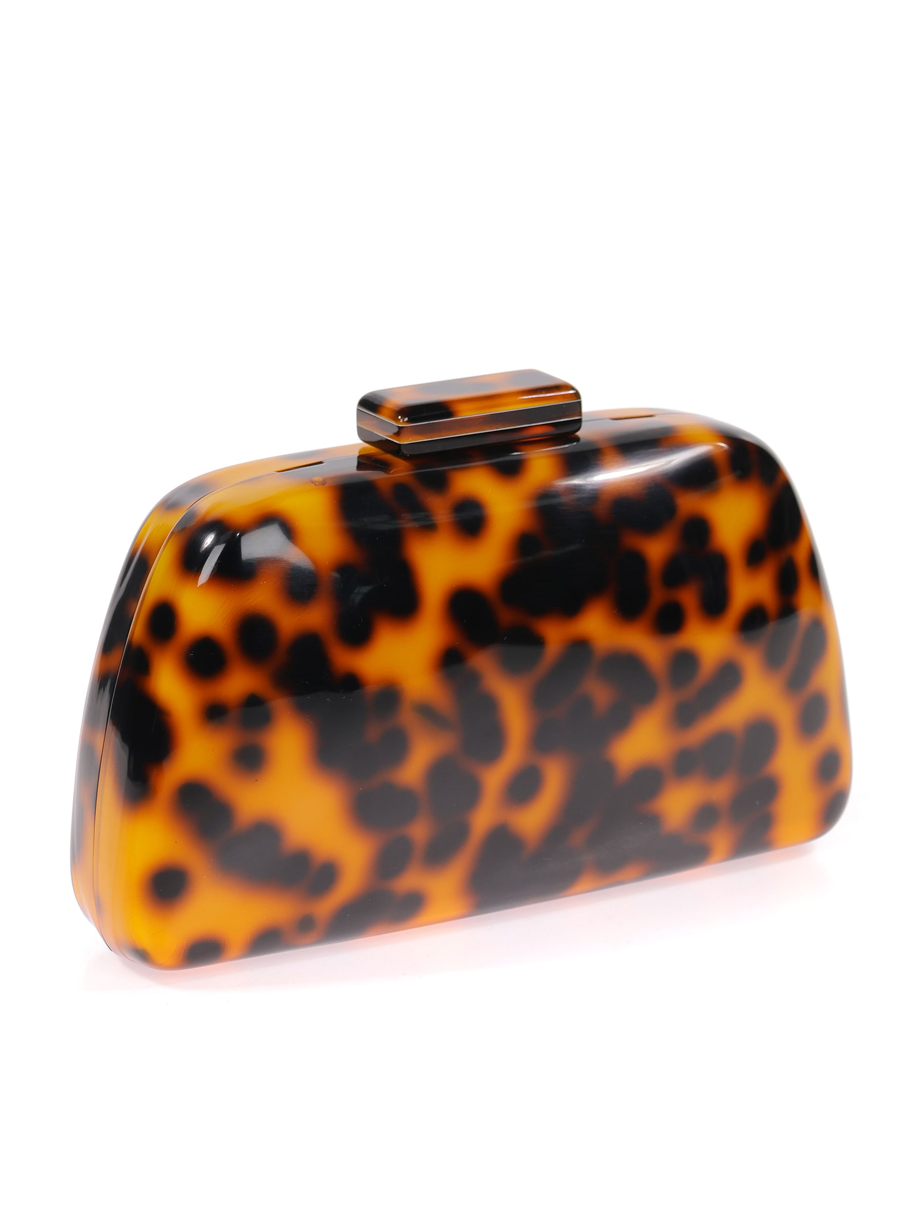 Borsa clutch da sera in madreperla con stampa leopardo.