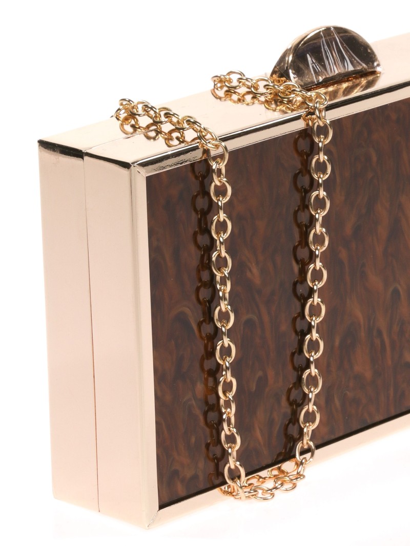 Borsa da festa. Materiale simil madreperla. Dettaglio metallico. Tracolla a catena. Fodera senza tasca interna. Chiusura metallica dorata.