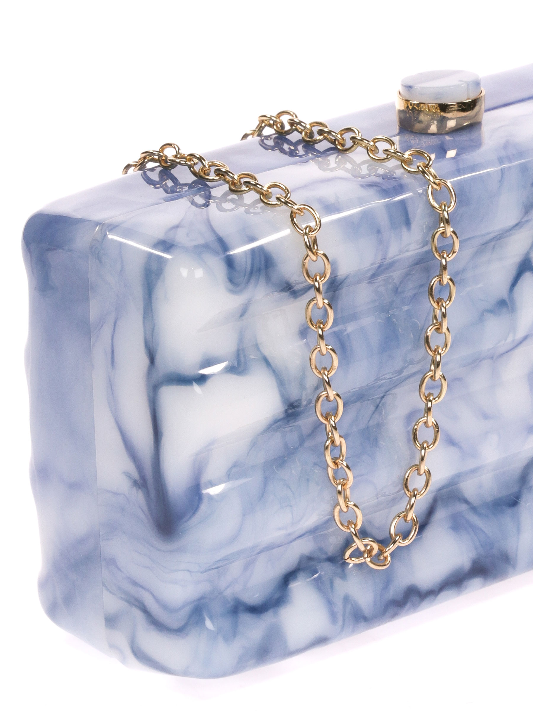 Borsa da festa. Materiale simil madreperla. Tracolla a catena. Fodera senza tasca interna. Chiusura magnetica.