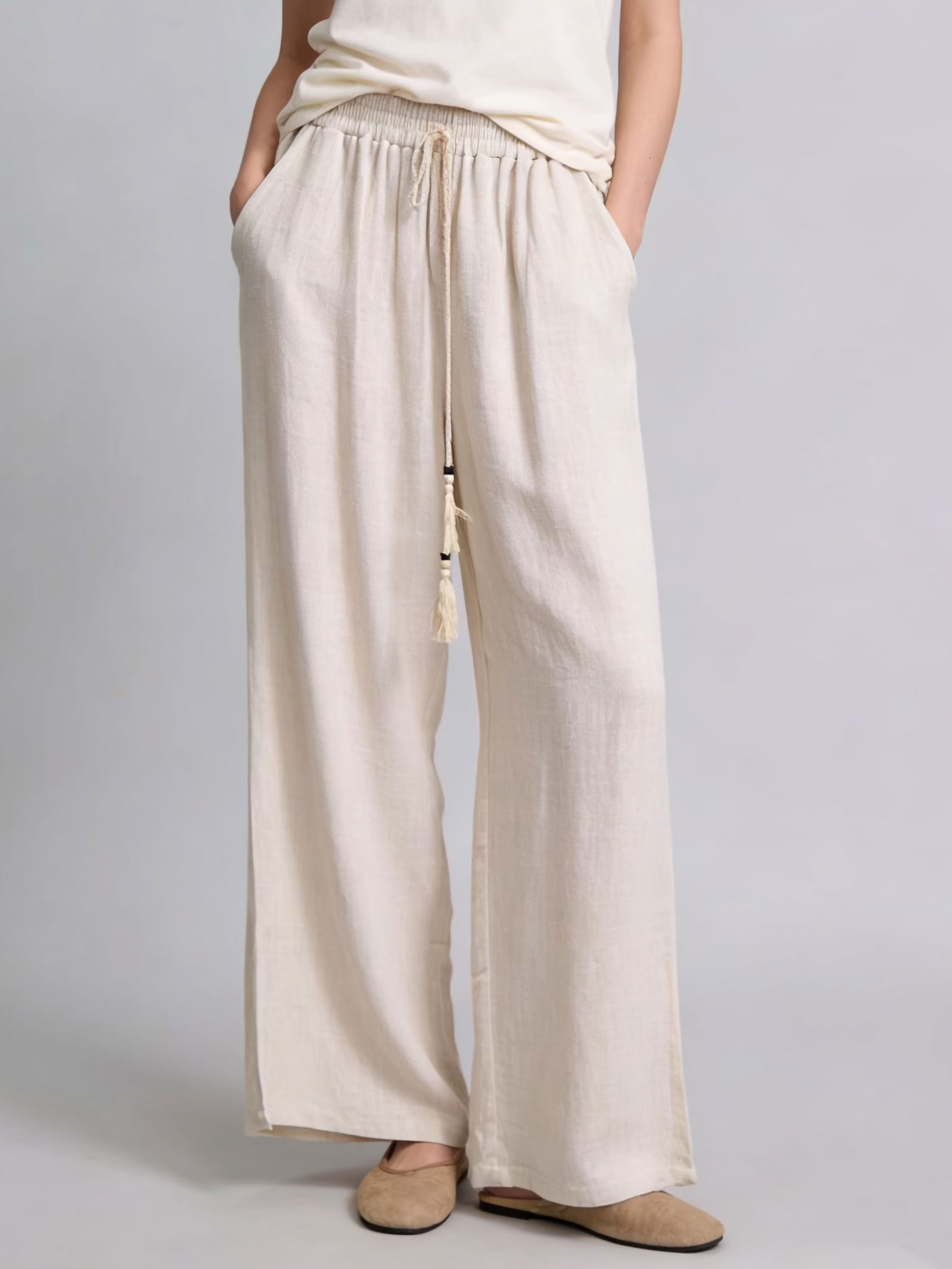 Pantaloni a gamba larga effetto lino. Vita elasticizzata con coulisse regolabile e nappe. Tasche laterali.