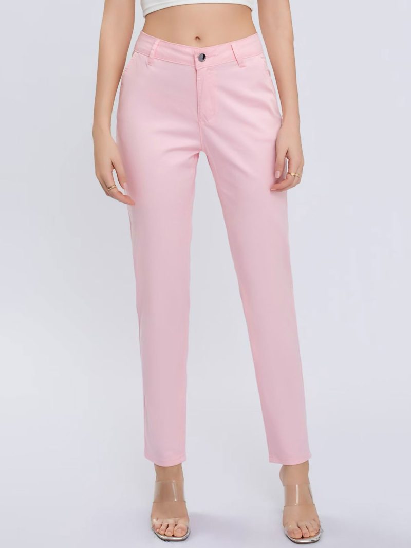 Pantaloni elasticizzati. Vita alta. Tasche laterali. Chiusura frontale con zip e bottone.