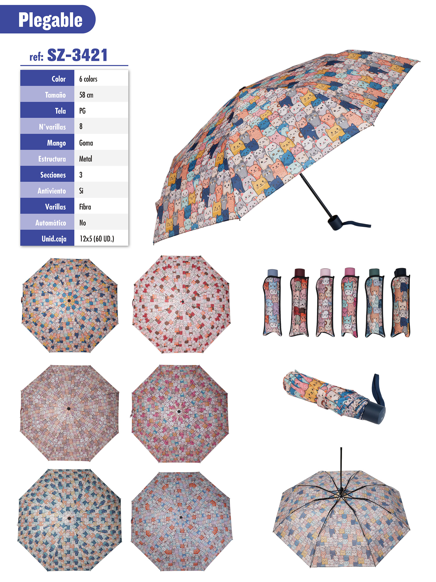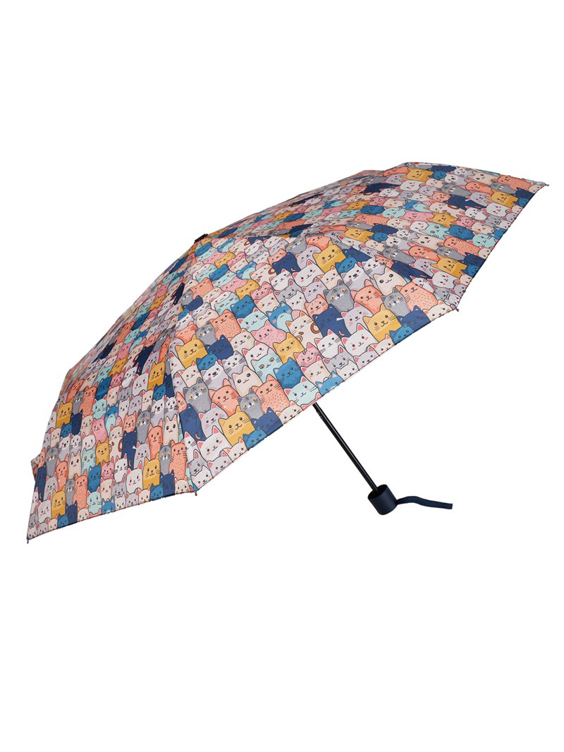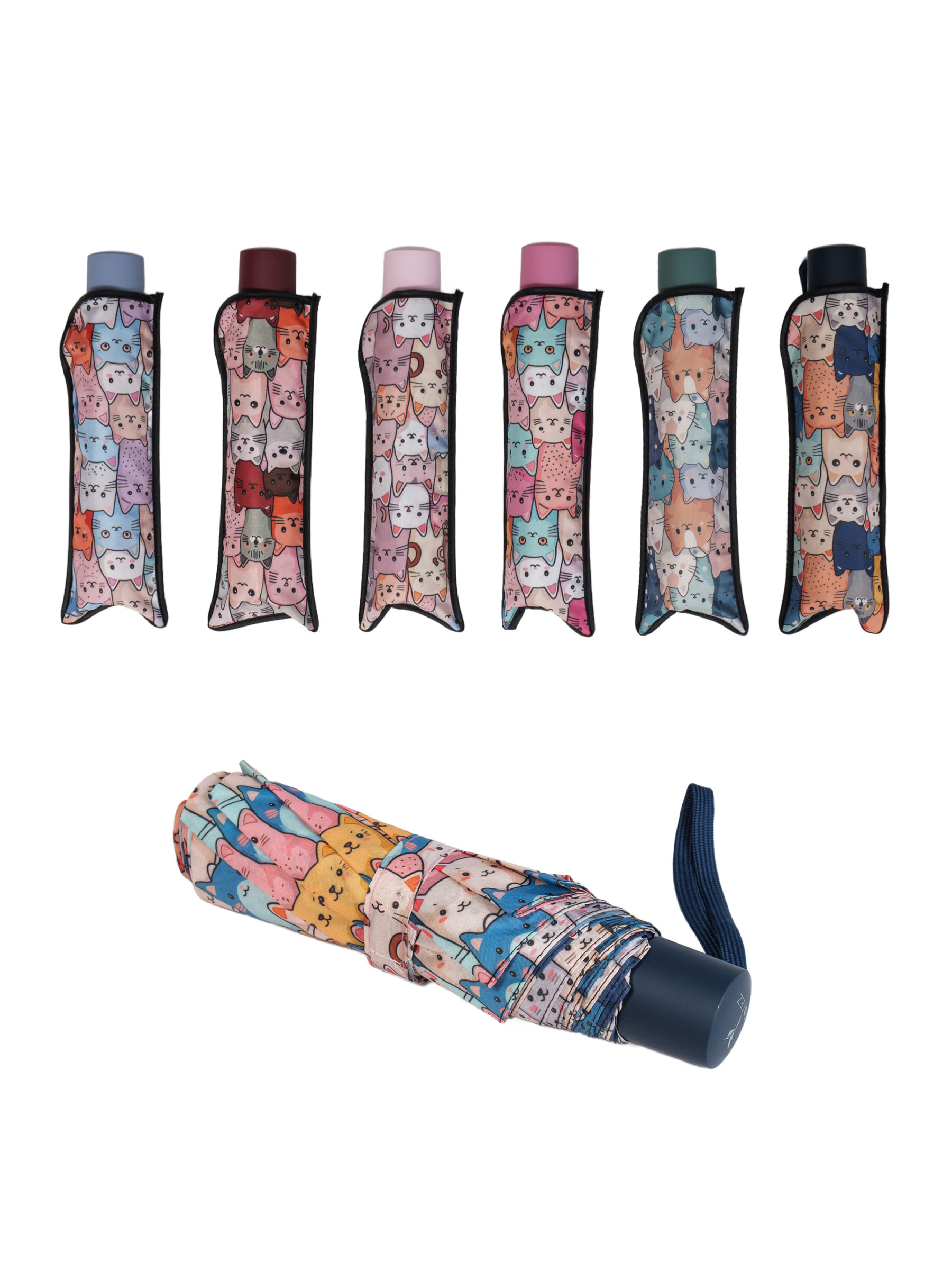 Ombrello pieghevole con stampa di gattini. Tessuto in poliestere. Antivento. Non automatico. 8 stecche in fibra di vetro. Manico in gomma. Struttura in metallo. 3 sezioni. Colori assortiti. Lunghezza: 58 cm.