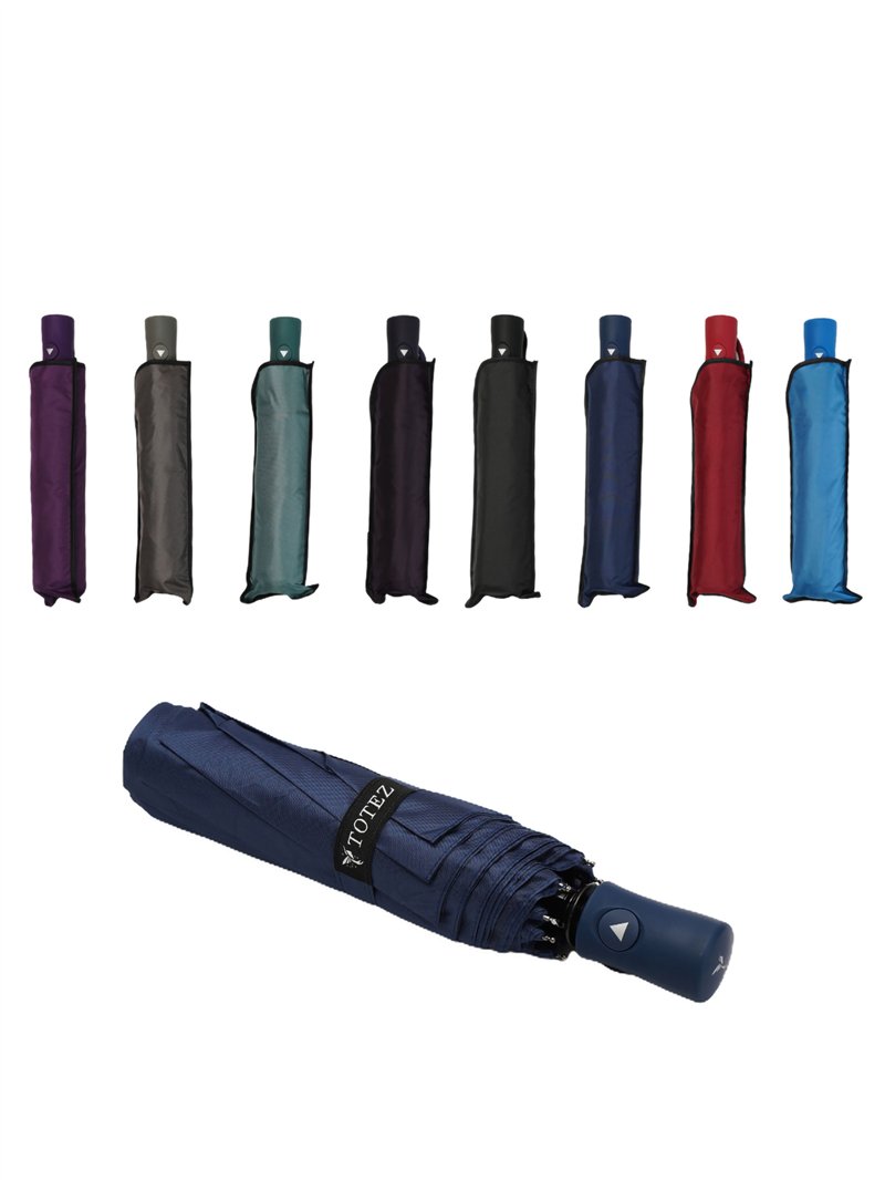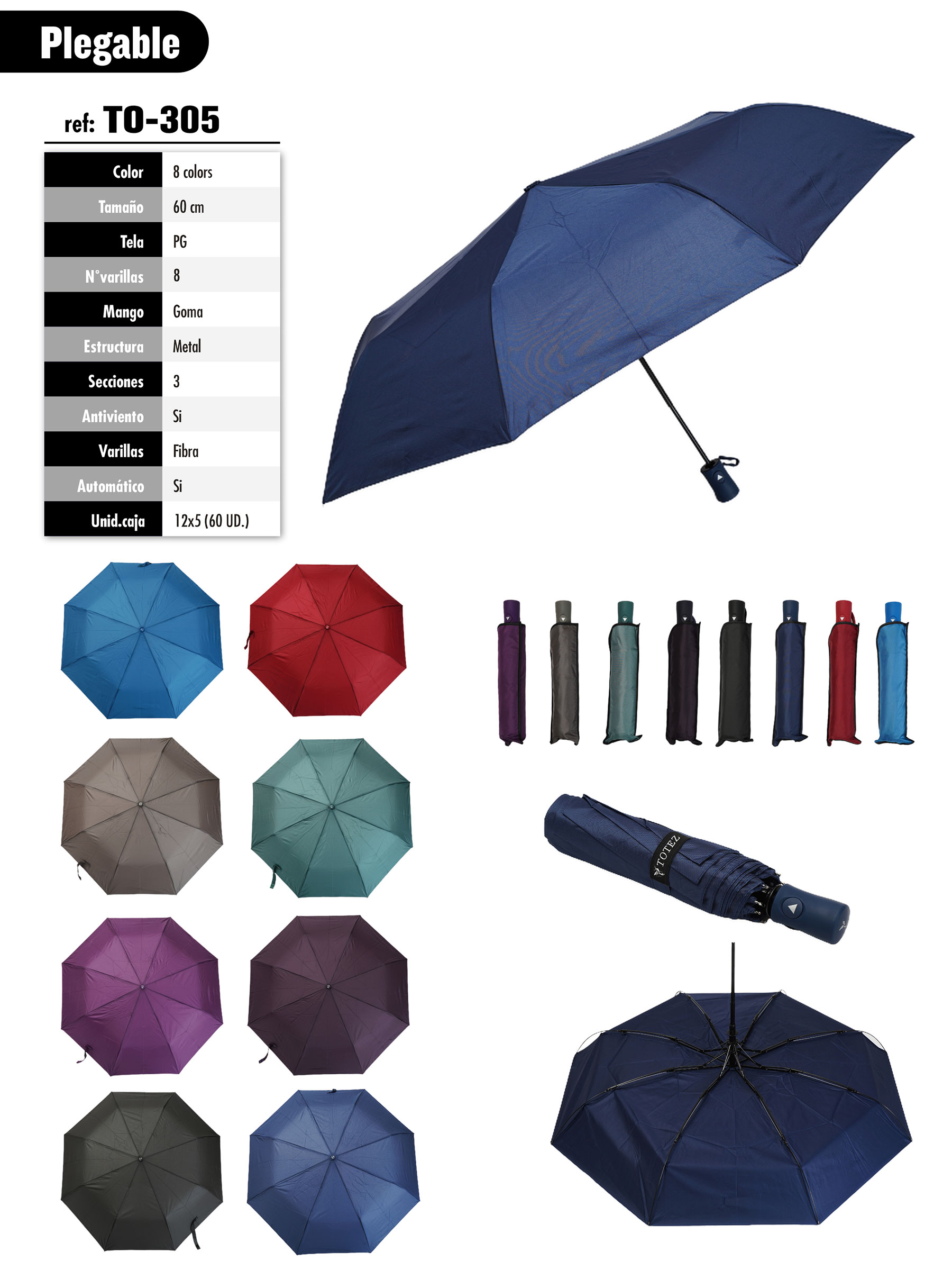 Ombrello pieghevole liscio. Tessuto PG. Antivento. Automatico. 8 stecche in fibra. Manico in gomma. Struttura in metallo. 3 sezioni. Colori assortiti.