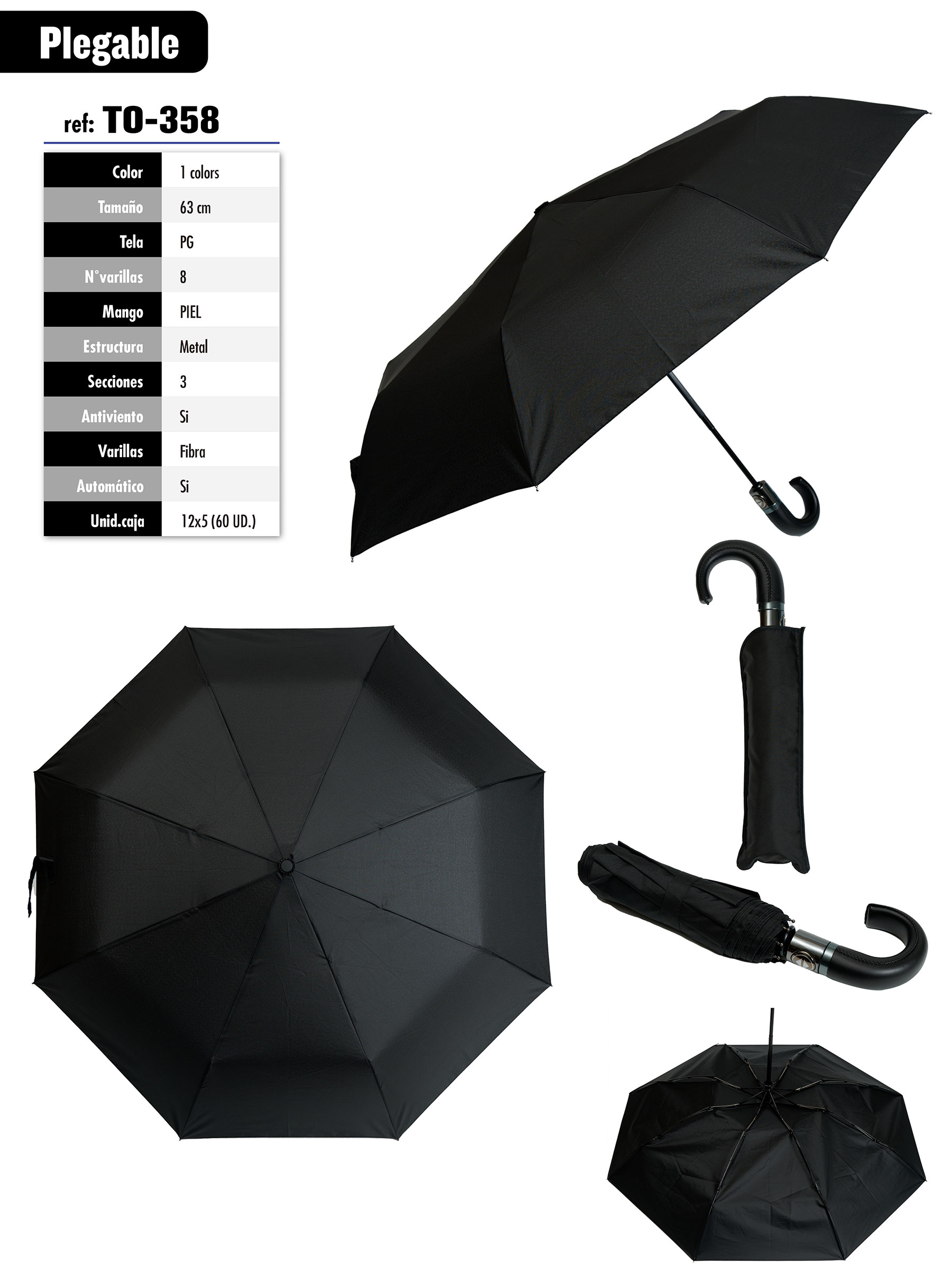 Ombrello pieghevole nero con manico in pelle. Tessuto PG. Antivento. Automatico. 8 stecche in fibra. Manico in pelle. Struttura in metallo. 3 sezioni. Colori assortiti.