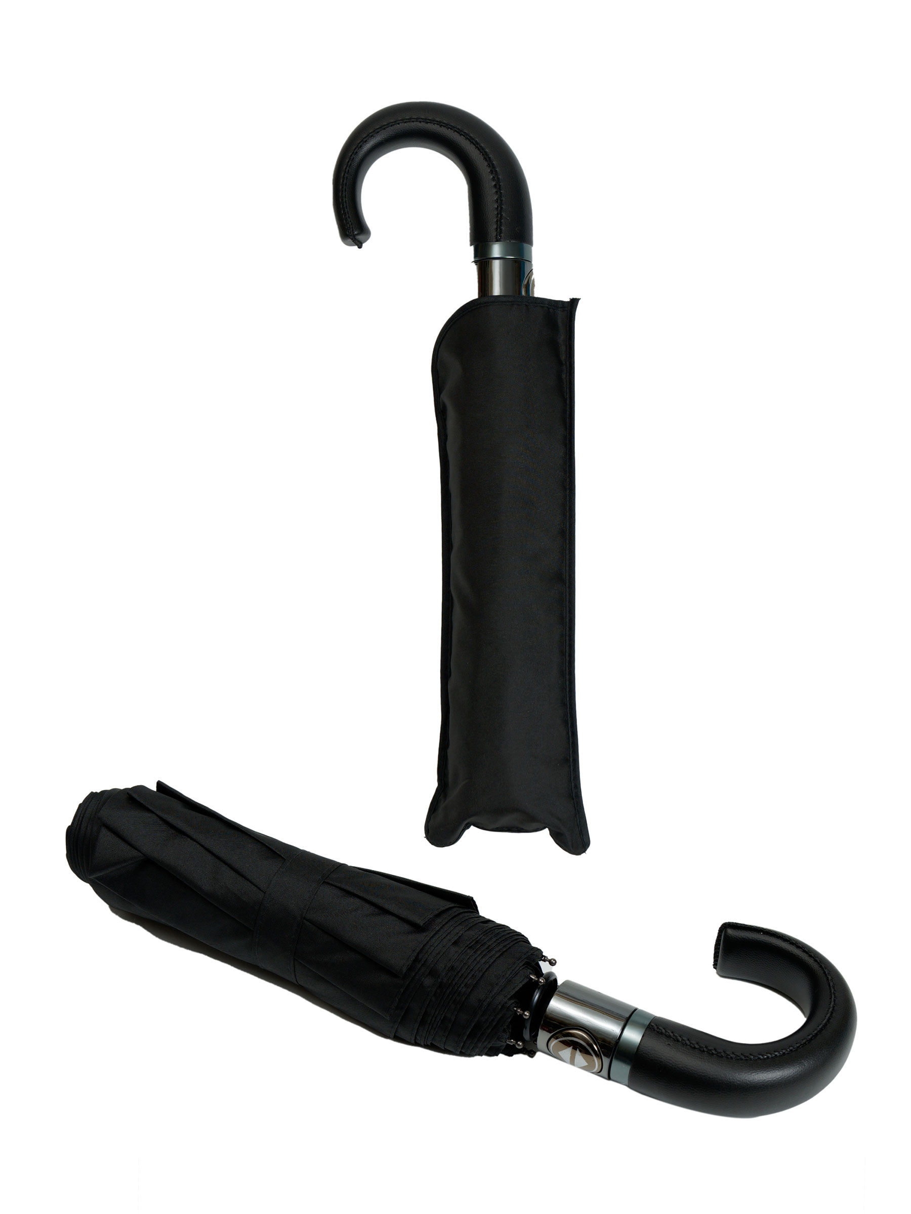 Ombrello pieghevole nero con manico in pelle automatico antivento.