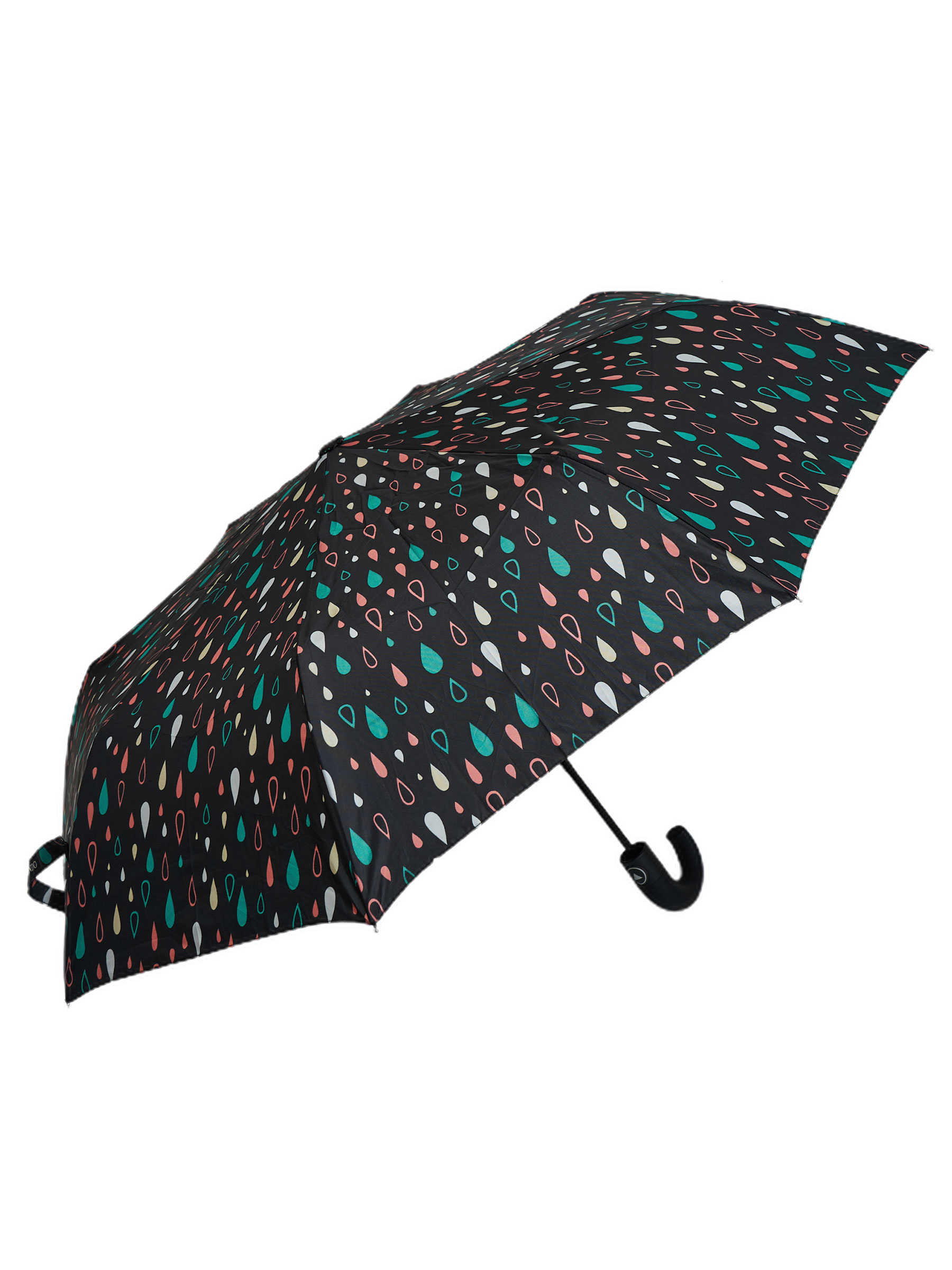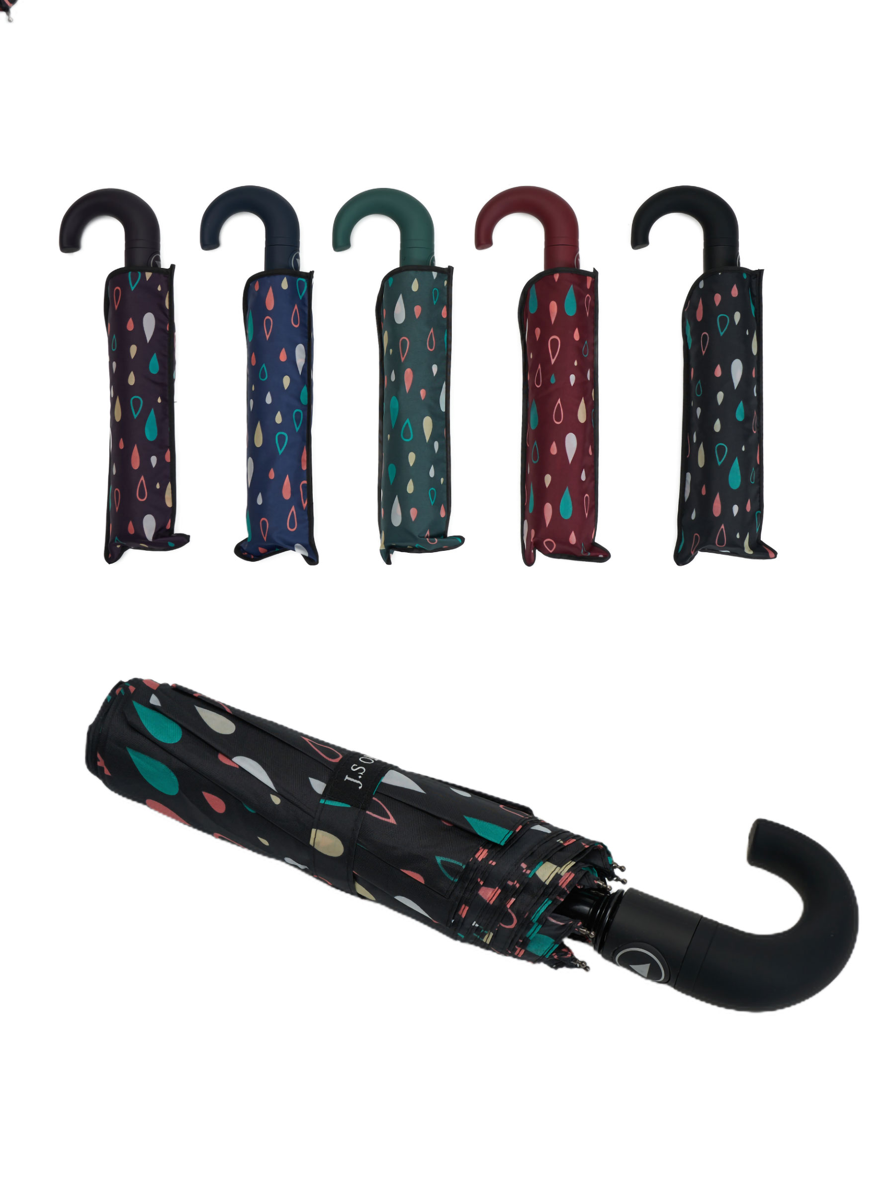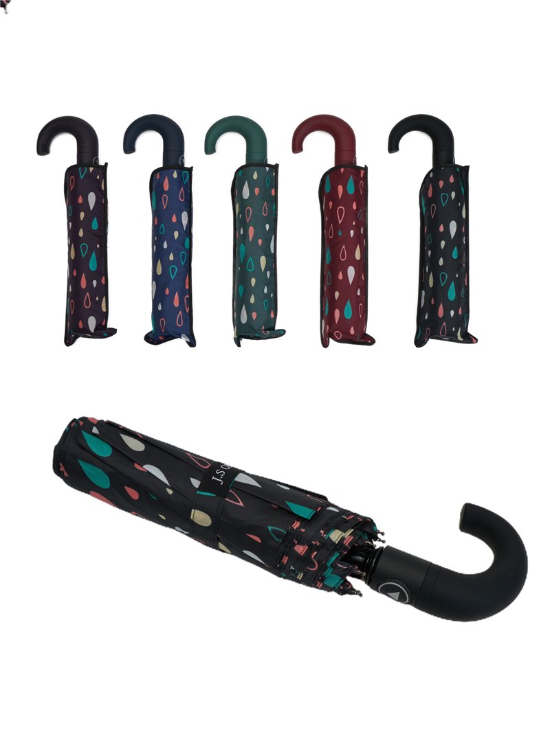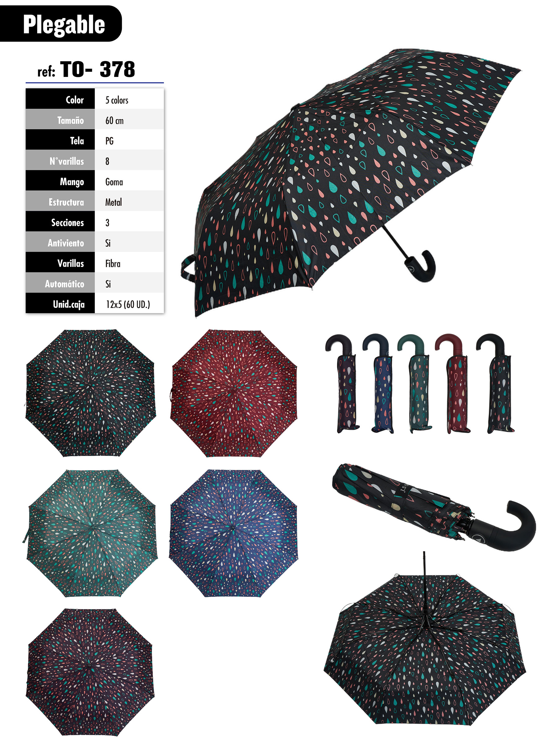 Ombrello pieghevole gocce di pioggia. Tessuto PG. Antivento. Automatico. 8 stecche in fibra. Manico in gomma. Struttura in metallo. 3 sezioni. Colori assortiti. Lunghezza: 60 CM.