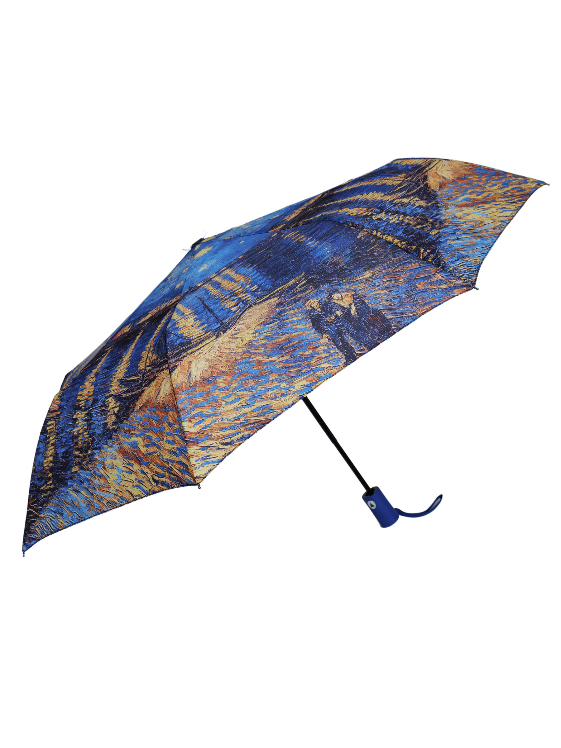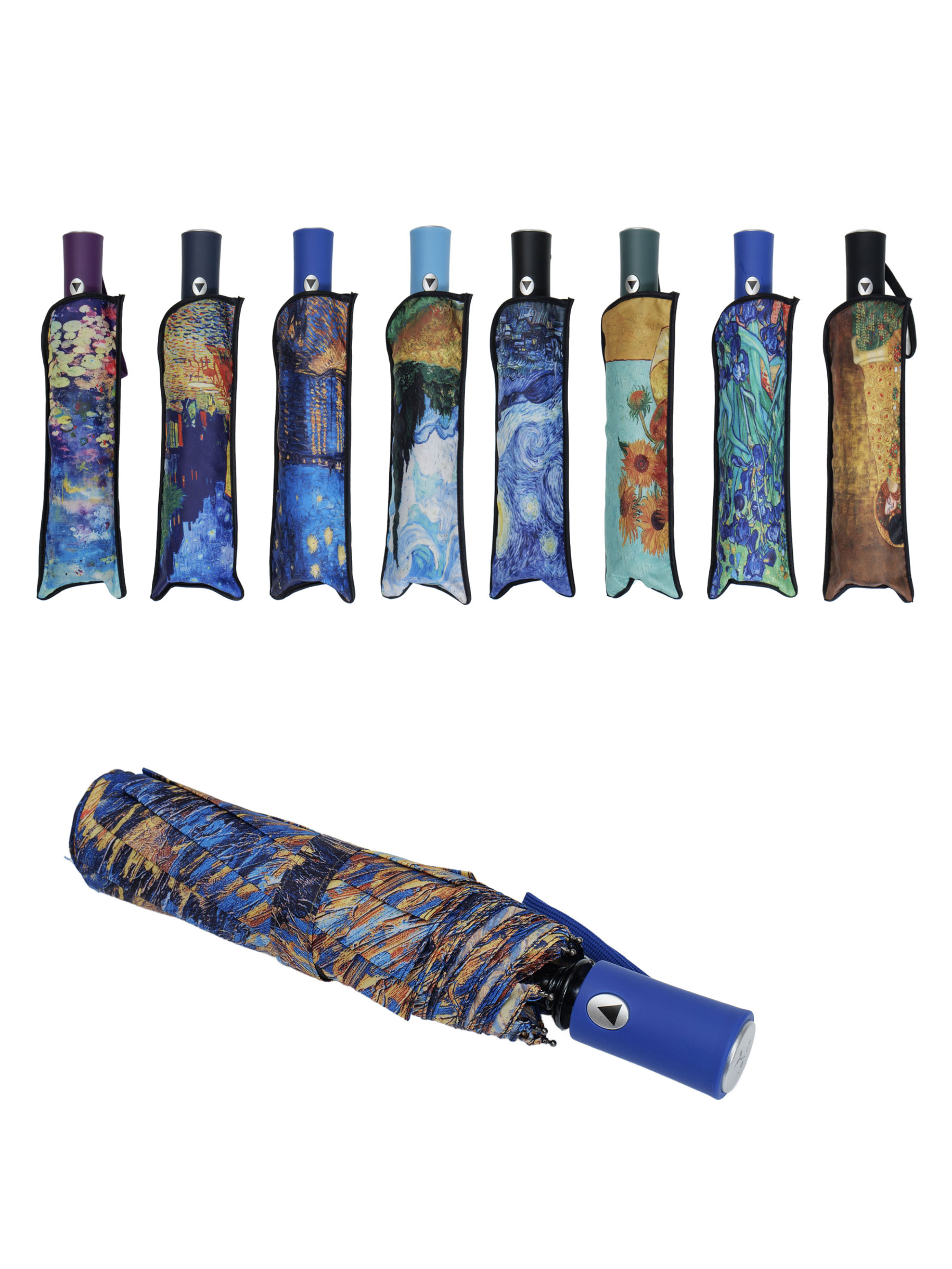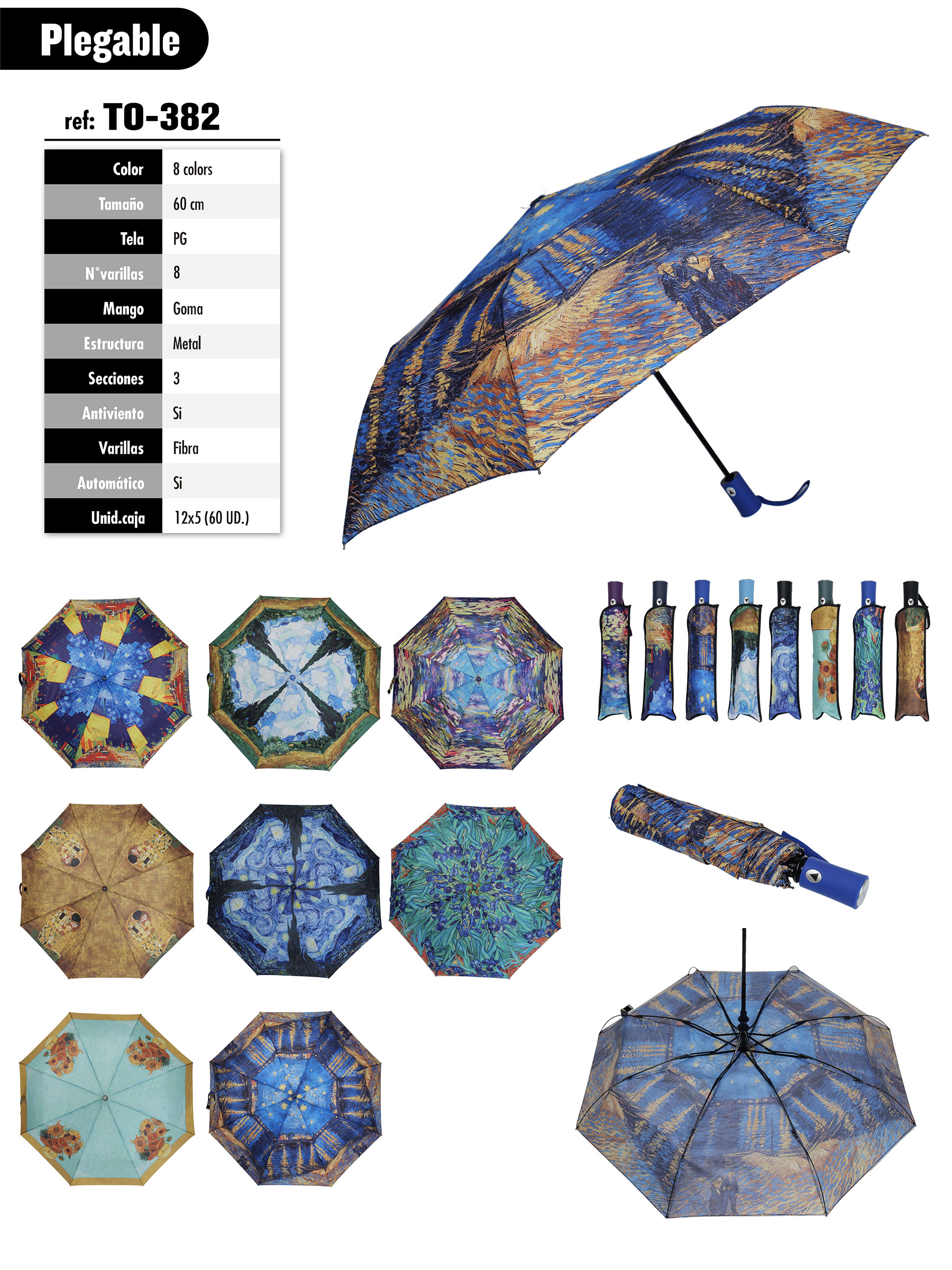 Ombrello pieghevole stampato. Tessuto PG. Antivento. Automatico. 8 stecche in fibra. Manico in gomma. Struttura in metallo. 3 sezioni. Colori assortiti.