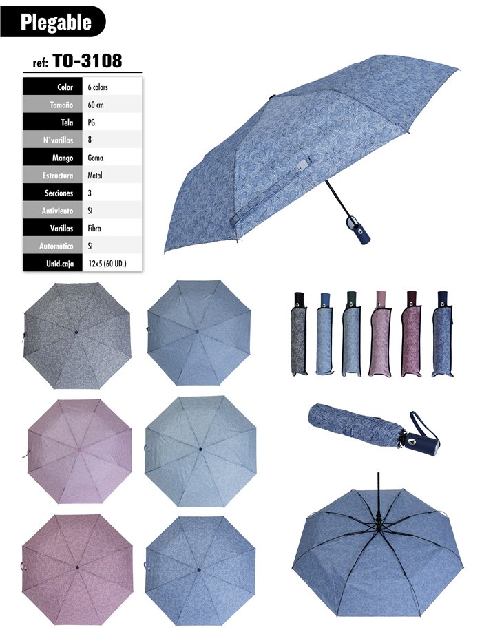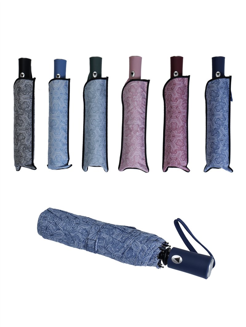 Ombrello pieghevole stampato. Tessuto PG. Antivento. Automatico. 8 stecche in fibra. Manico in gomma. Struttura in metallo. 3 sezioni. Colori assortiti.