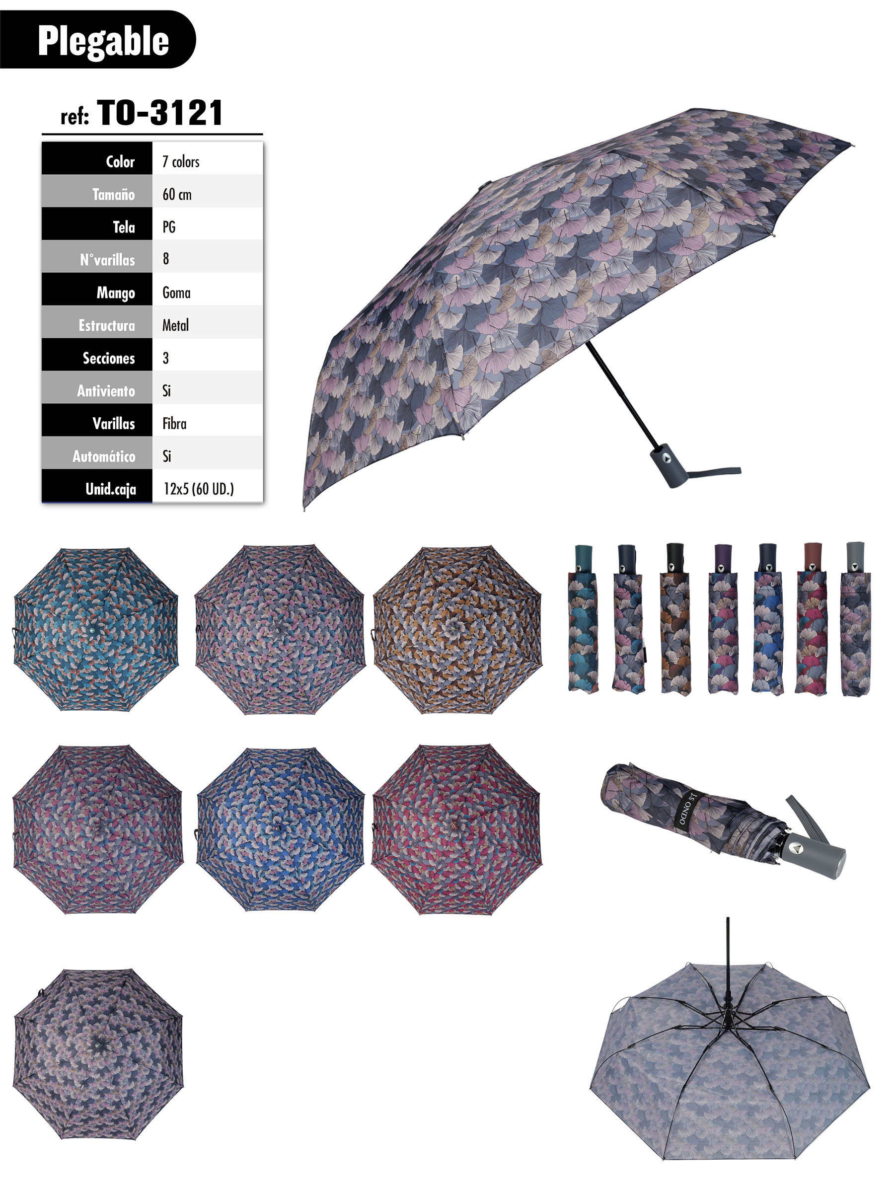 Ombrello pieghevole a foglie. Tessuto PG. Antivento. Automatico. 8 stecche in fibra. Manico in gomma. Struttura in metallo. 3 sezioni. Colori assortiti. Lunghezza: 60 CM.