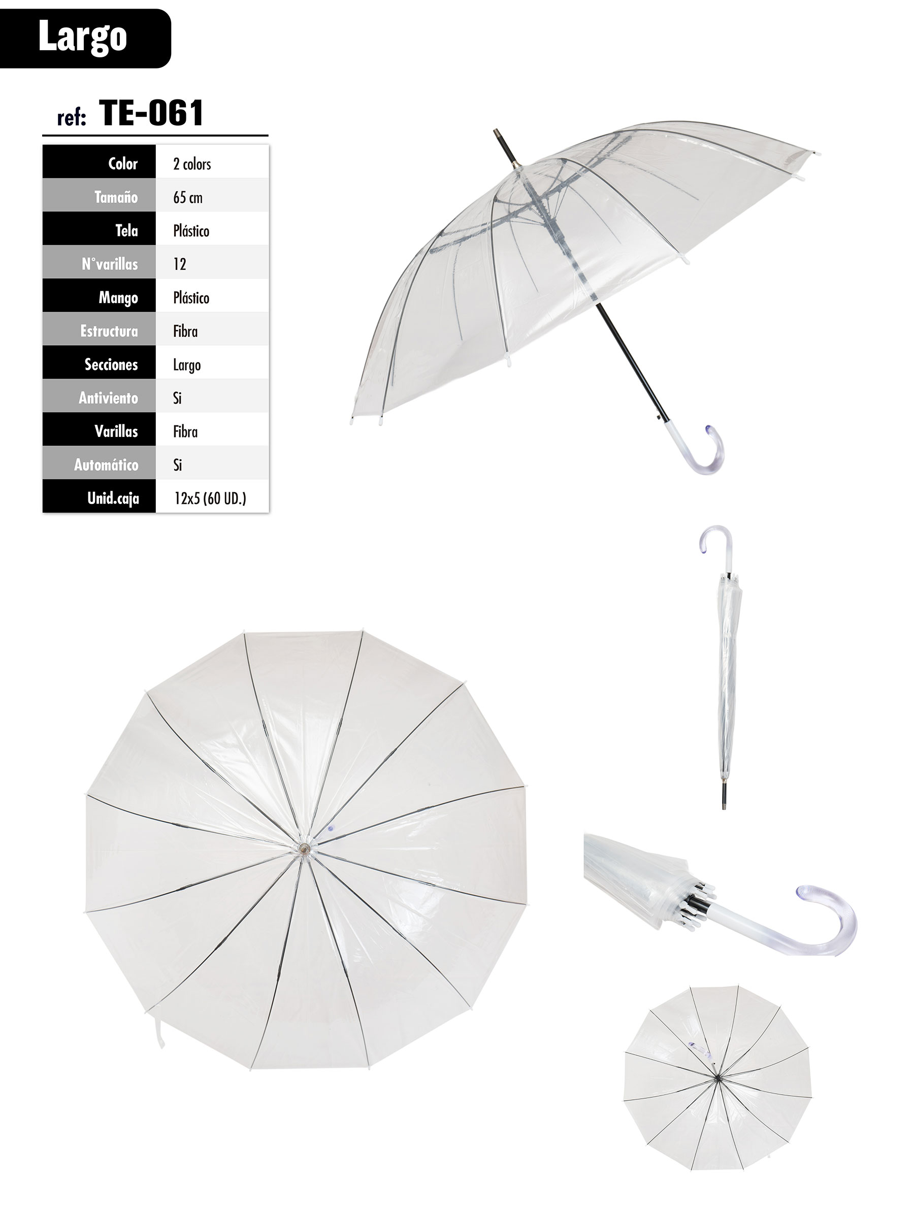 Ombrello lungo trasparente da 65 cm con 12 stecche in fibra, apertura automatica e sistema antivento. Manico in plastica a uncino.