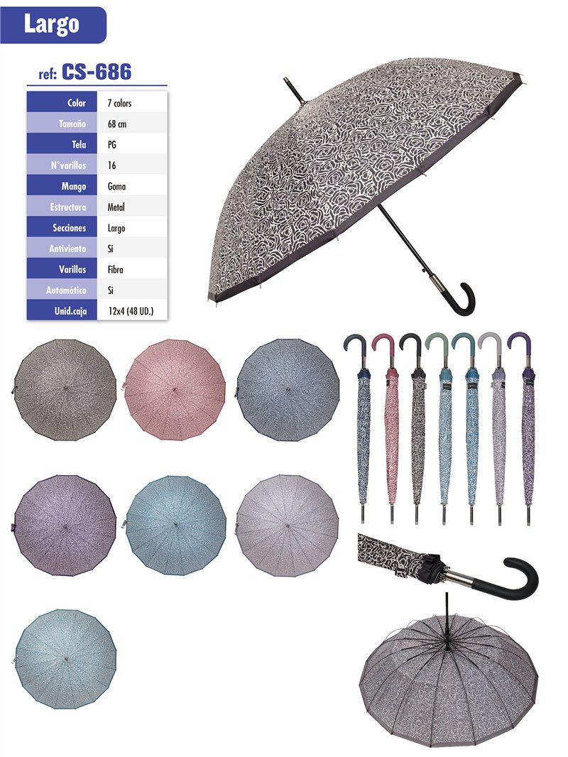 Ombrello lungo automatico con rose disegnate. Cupola da 68 cm in tessuto PG, 16 stecche in fibra e struttura metallica. Resistente al vento e con manico in gomma.