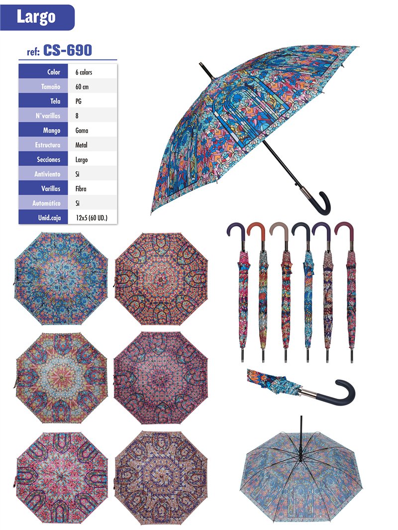 Ombrello lungo automatico, antivento. 8 stecche in fibra e struttura metallica. Tessuto PG e manico in gomma. Stampato con vetrate e mandala.