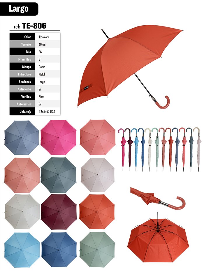 Ombrello lungo automatico di colore unito. Asta in fibra e struttura metallica antivento, manico in gomma e tessuto PG.