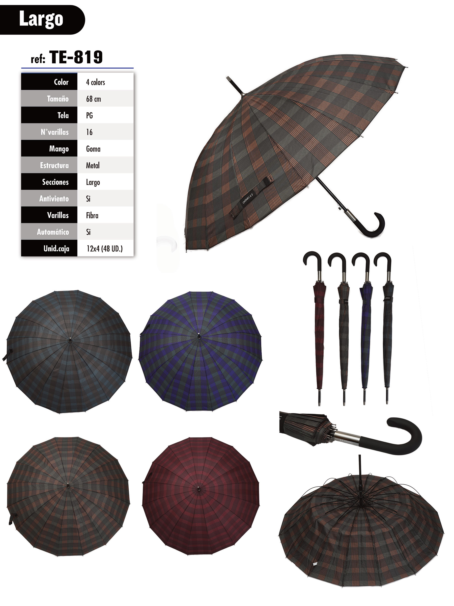 Ombrello lungo automatico a quadri. 16 stecche in fibra e struttura metallica antivento, manico in gomma e tessuto PG.