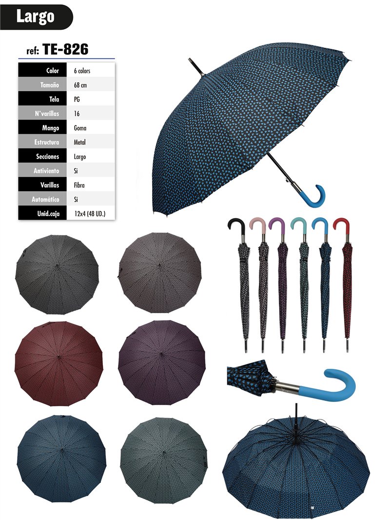 Ombrello lungo automatico con micro stampa di cuori. 16 stecche in fibra e struttura metallica antivento, manico in gomma e tessuto PG.