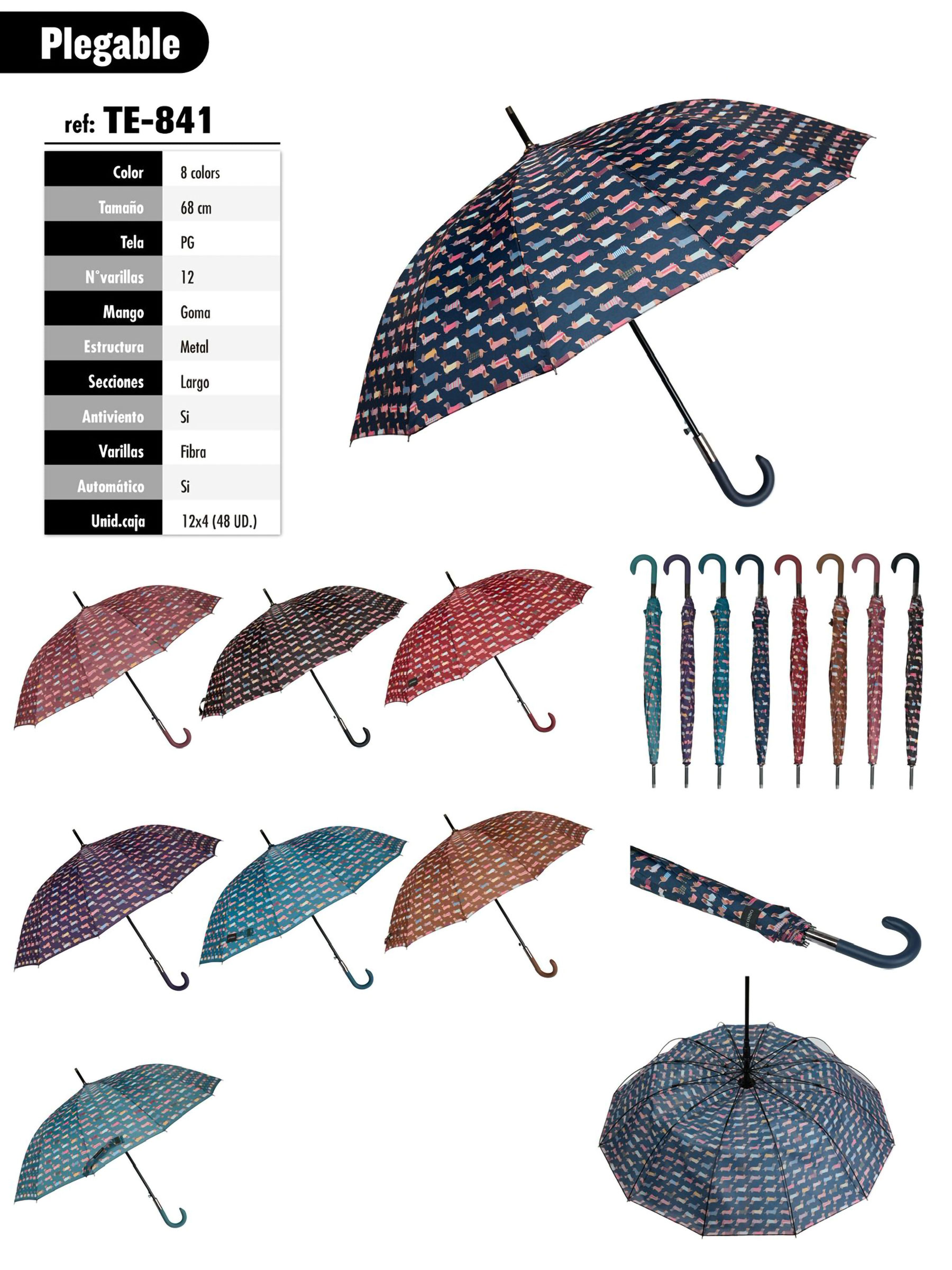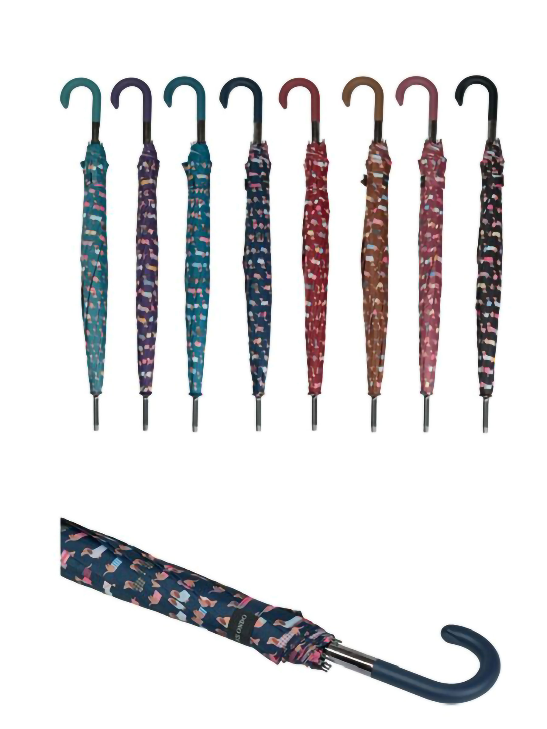 Ombrello lungo con apertura automatica e stampa di un bassotto. Tessuto resistente con sistema antivento, stecche in fibra e struttura metallica. Manico in gomma. Disponibile in 8 colori assortiti.