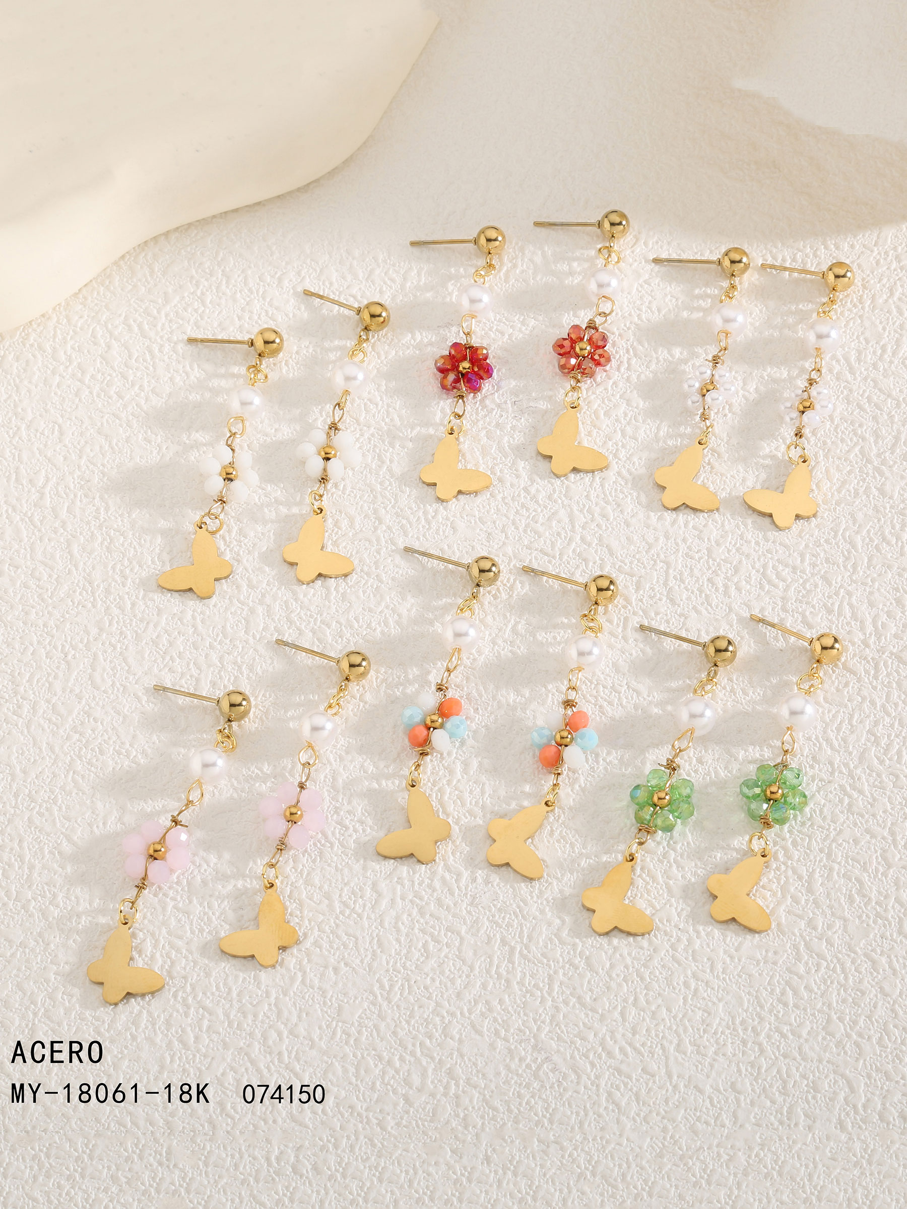Orecchini lunghi con fiori, farfalle e perle. Acciaio inossidabile. Colori assortiti.