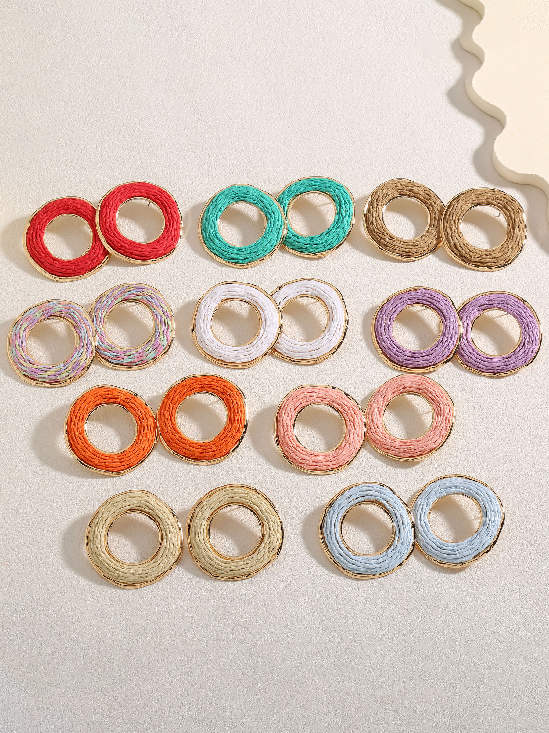 Orecchini a cerchio rotondi in rafia con bordo dorato.