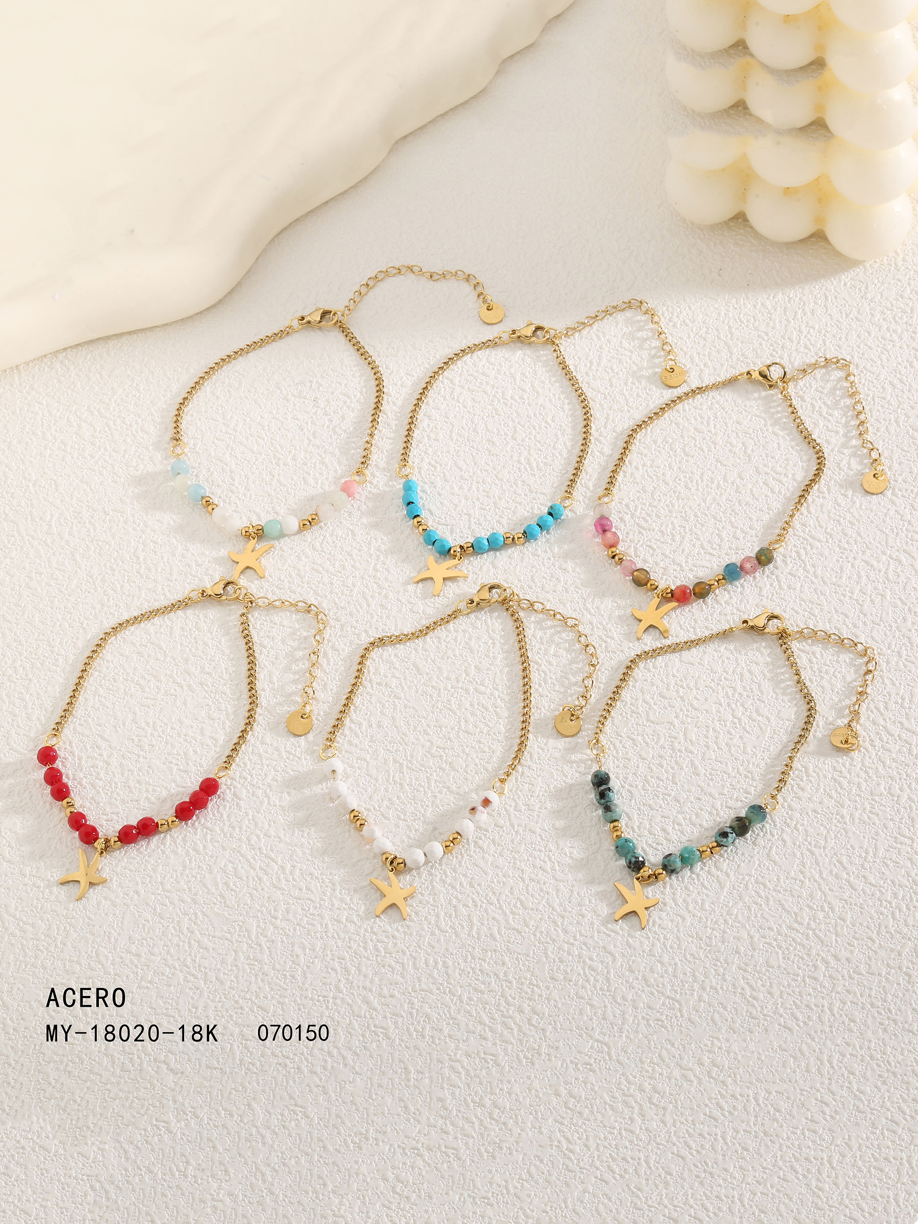 Bracciale con perline in resina e ciondolo a forma di stella marina. Acciaio inossidabile. Colori assortiti.