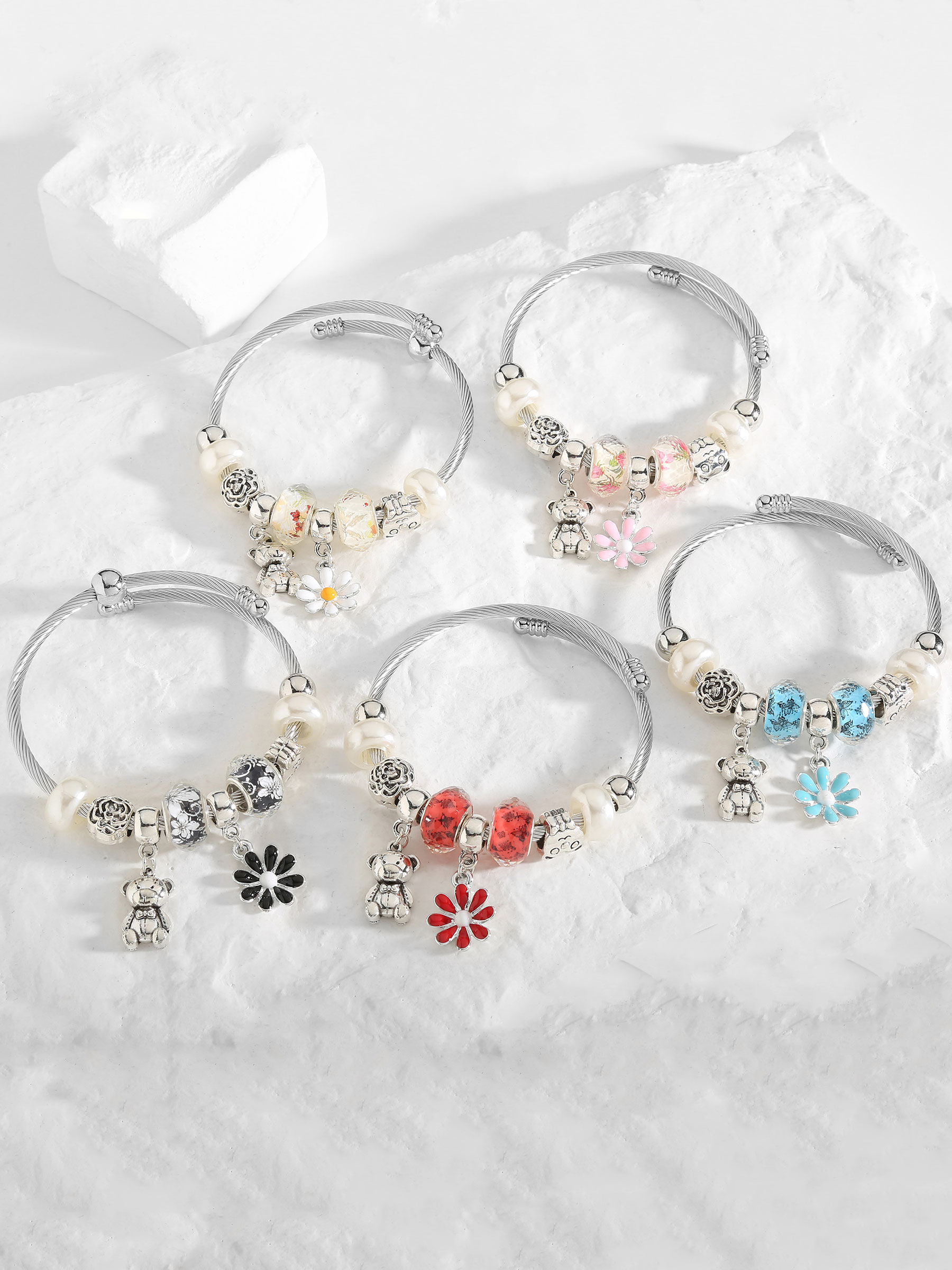 Dettagli del bracciale in acciaio inossidabile con charm smaltato a forma di fiore e orsetto BS-LQ20133-ARGENTO