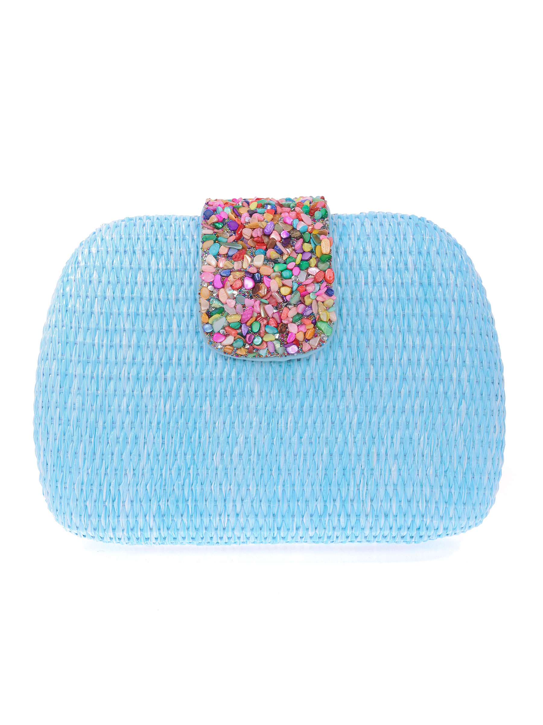 Dettagli di AD-22272 CELESTE borsa clutch da festa effetto rafia con perline