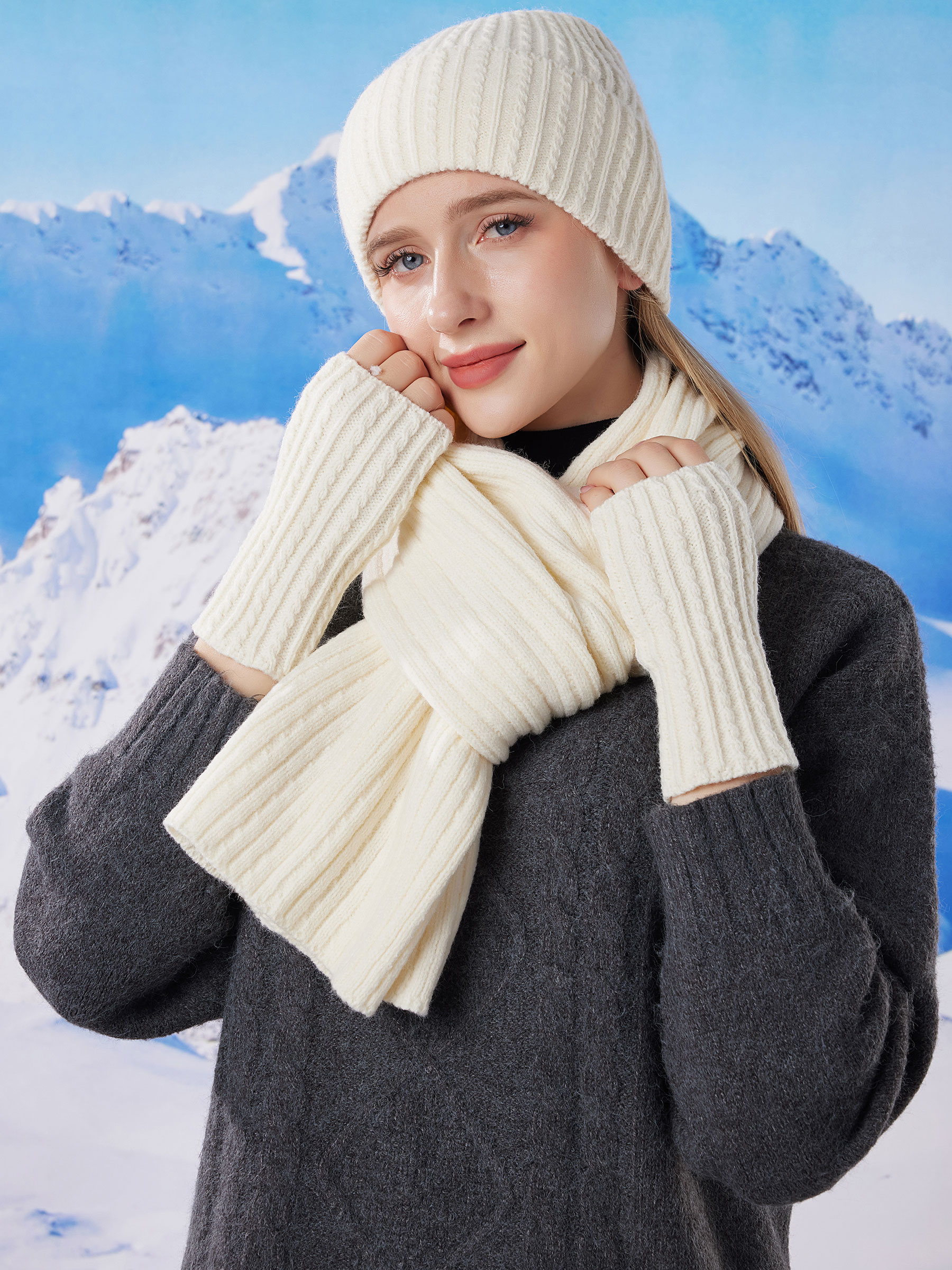Set di tre pezzi in maglia a coste composto da berretto, sciarpa e guanti senza dita.