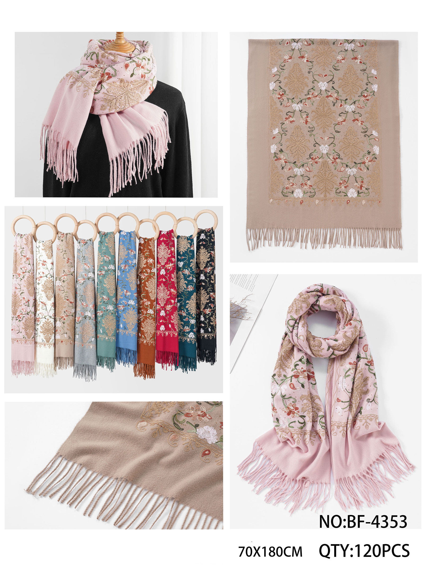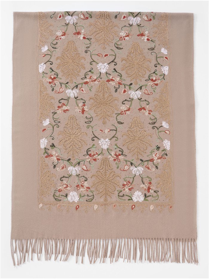 Bufanda bordada de flores con strass y flecos. Tacto suave.