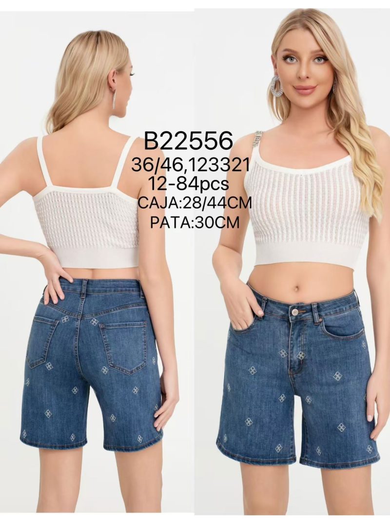 Bermuda in denim ricamati. Vita alta. Cinque tasche. Chiusura frontale con zip e bottone metallico.