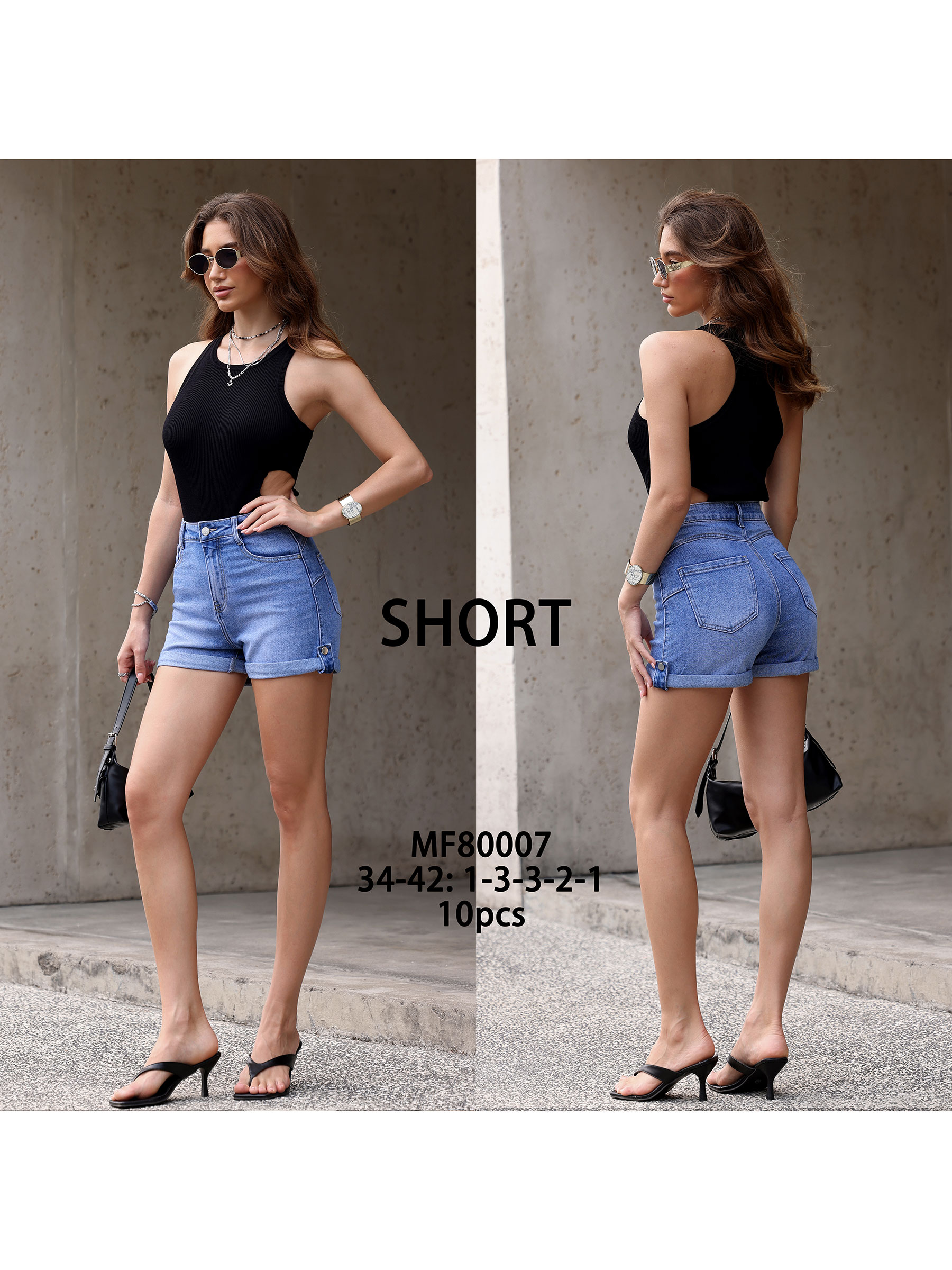 Shorts in denim. Vita alta. Orlo risvoltato con linguetta laterale. Cinque tasche. Chiusura frontale con zip e bottone in metallo.