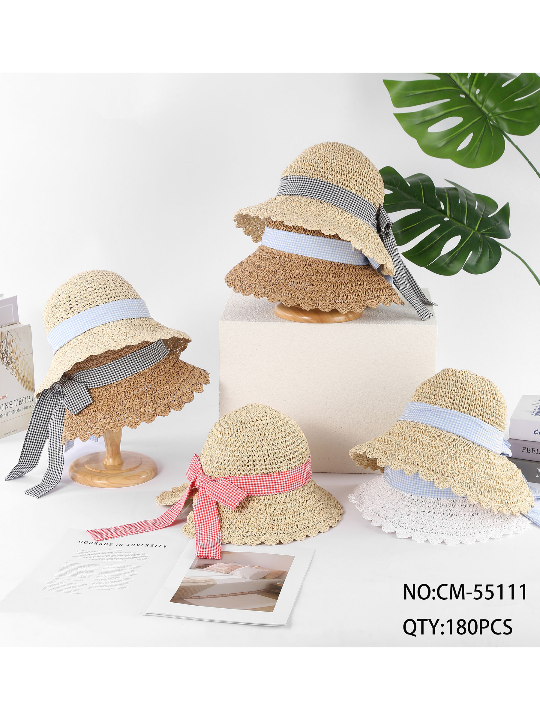 Cappello in rafia con fiocco a quadretti.